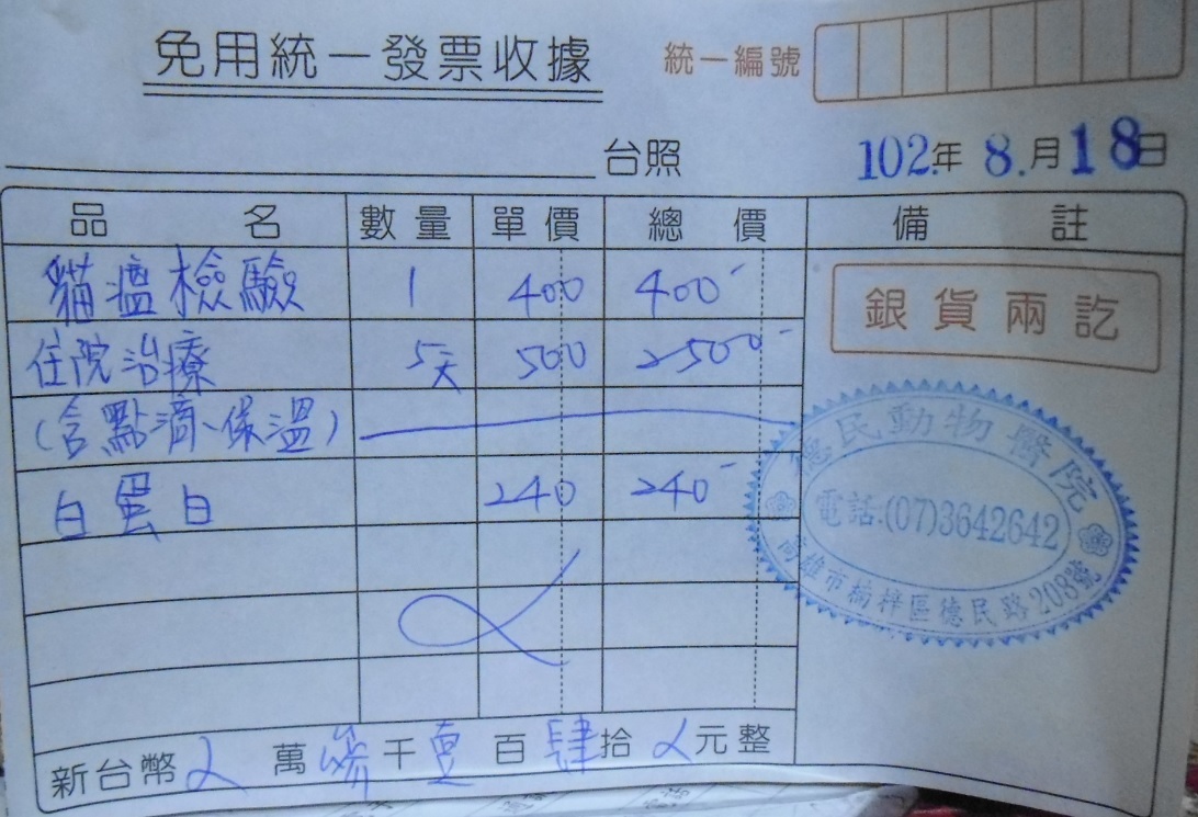 主題: 拉肚子失溫小虎斑 申請者姓名: 拳四郎 花色: 申請日期: 2013-08-15 06:39:23 申請者部落格: 申請者臉書網址: 所在縣市/合作醫院: 高雄市/新德民動物醫院 治療費用: 3140元 需求人數: 8人 已結案 (2013-09-19 17:51:11) 報名人員: Chiaping Chang x2(已付款)、catnana(已付款)、Mavis Yang(已付款)、Norman Wu(已付款)、惠青(已付款)、Ago Walker(已付款)、張鋅祺(已付款)、 候補人員: 動物病情說明: 這隻小虎斑大約3個月大