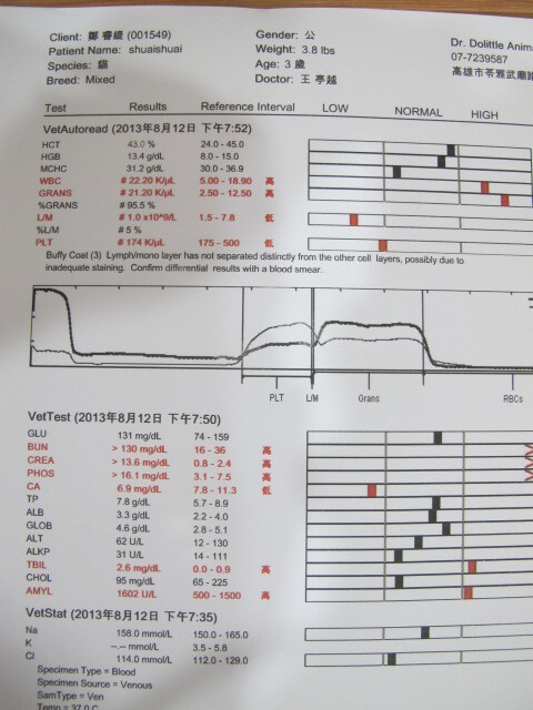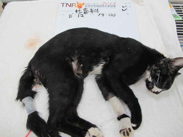 主題: 高雄市新興區奄奄一息的貓咪 申請者姓名: Paney Cheng 花色: 申請日期: 2013-08-16 17:02:12 申請者部落格: 申請者臉書網址: 所在縣市/合作醫院: 高雄市/恩澤動物醫院 治療費用: 3890元 需求人數: 9人 已結案 (2013-09-03 16:23:58) 報名人員: Tingyun Tzeng x2(已付款)、Hllen Liu(已付款)、Daisy Juang(已付款)、Paney Cheng(已付款)、Paney Cheng(已付款)、maiwu(已付款)、簡艾倫(已付款)、Layla Hsu(已付款)、 候補人員: 動物病情說明: 8月12日晚上原本與貓友一起帶著跟壽山園區借的誘捕籠要前往誘捕三民區黃興路的受傷貓咪就醫,途中發現有人po文通報新興區錦田路與黃海街發現奄奄一息的街貓,感覺情況更是危急,所以決定先前往救助,到達現場時發現貓咪真的已經全身癱軟妹妹把它放在一個箱子哩,但是礙於我們騎車怕貓咪掉出箱子,所以決定先把他移至誘捕籠,發現他已經連反抗的力量都沒有,當下好難過,他只剩下眼睛會轉動還有呼吸,手還不時地抖動....我們更是飛車把他帶往武廟路的杜立德醫院,到達醫院時醫生立即幫他做詳細的檢查及診治,發現貓咪已經嚴重漲尿,醫生幫他擠尿時他有血塊凝滯,嗚嗚...貓咪還發出虛弱的哭泣聲,他後來血檢出來發現腎指數異常,鉀離子飆高到測不出來,貓咪還出現心跳不規律的情形,醫生判斷他已經尿毒,需要先幫他導尿出來,打針...還有更詳細與專業的醫療,醫生說狀況非常不樂觀,前兩天是危險期會盡力醫救貓咪,由於手頭還有一隻消防隊帶出正在結紮的貓咪,還有上個月於建工路救到的小幼貓目前接至家中照顧,這一切費用都是自費...醫治的費用真的已經負擔不起,但我還可以出個一千左右,希望協會能夠幫忙通過此醫助專案的申請,希望能夠幫幫此貓咪,他真的好痛苦,真的好不捨...(泣) 動物近況說明: 好難過,帥帥貓咪經急救無效已往生R.I.P...