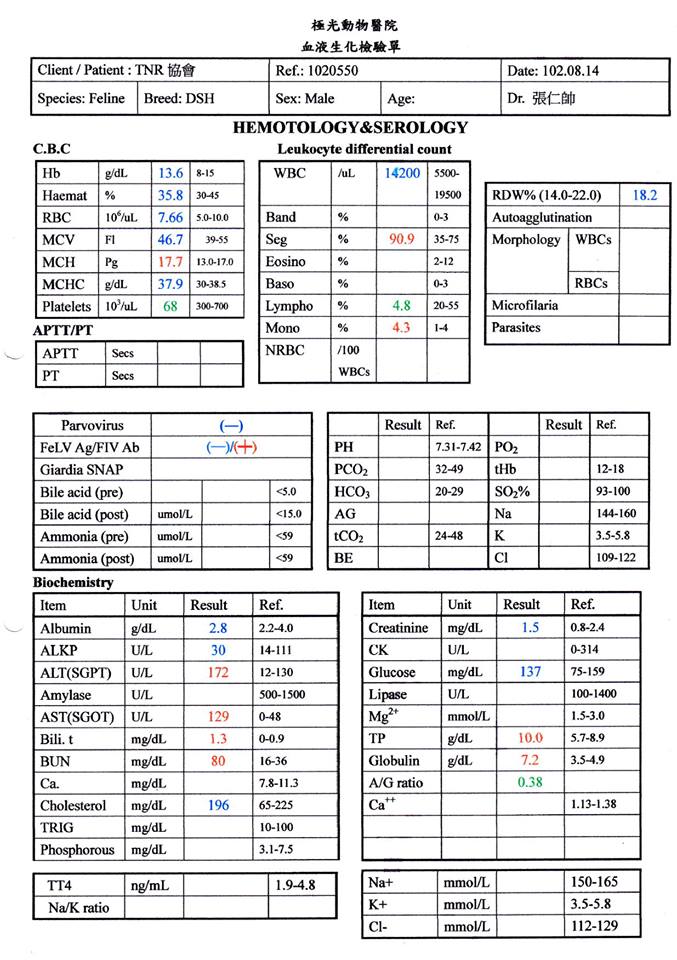 主題: 在路邊一直喘氣走不動貓咪 申請者姓名: 陳曉霏 花色: 申請日期: 2013-09-03 07:42:03 申請者部落格: 申請者臉書網址: https://www.facebook.com/xiaofeic 所在縣市/合作醫院: 台北市/極光動物醫院 治療費用: 12795元 需求人數: 14人 已結案 (2014-01-10 18:02:50) 報名人員: conbao wu、jojo、kelly(已付款)、劉詠欣、Hsin-Yi Chiao(已付款)、Tiffany Shen(已付款)、Grace Luo(已付款)、SASA(已付款)、超凡(已付款)、HI HI Little(已付款)、美石主義(已付款)、Chen Ping、波波(已付款)、ERic YU(已付款)、Huimin Liu(已付款)、Emily Chou(已付款)、Sharon Kuo x2(已付款)、 候補人員: 動物病情說明: 在路邊看見一隻貓咪一直在用力喘氣