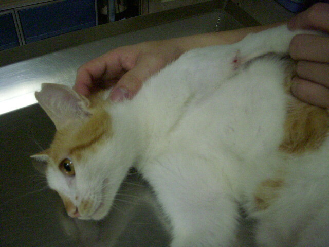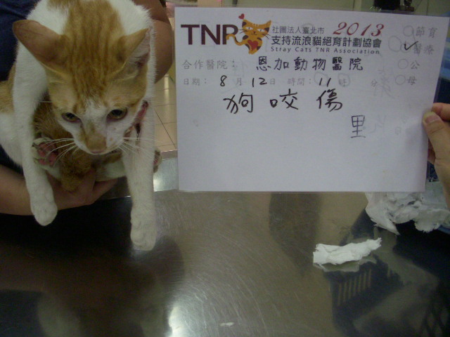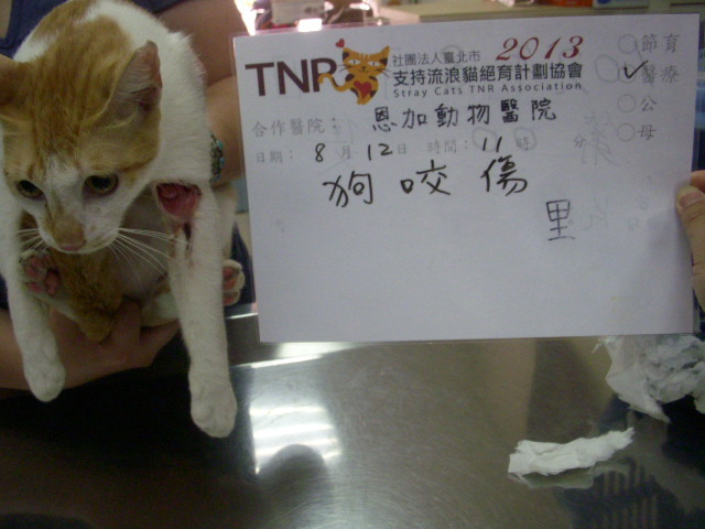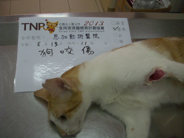主題: 被遊民養的群狗咬傷的黃白貓 申請者姓名: 陳怡靜 花色: 申請日期: 2013-09-05 14:49:31 申請者部落格: 申請者臉書網址: 所在縣市/合作醫院: 台北市/恩加動物醫院 治療費用: 5500元 需求人數: 12人 已結案 (2014-01-10 18:02:46) 報名人員: 王道凱(已付款)、黃安妮 x2(已付款)、張秀秀(已付款)、boudi(已付款)、Anita Lee(已付款)、裴路 x2(已付款)、Yu-han Hsieh、大聲說(已付款)、大聲說 x2(已付款)、Tiffany Shen(已付款)、 候補人員: 動物病情說明: 大龍街昨晚有一對遊民帶著一群沒綁繩的狗在大同街看到貓就狂追,有隻黃白貓跑被咬傷腳,還好牠嚇得衝進眼前的民宅躲避,這戶人家也沒將牠馬上趕出去,才留了一條命,但腿部有很深的咬傷;今早趕緊將牠送到恩加動物醫院治療