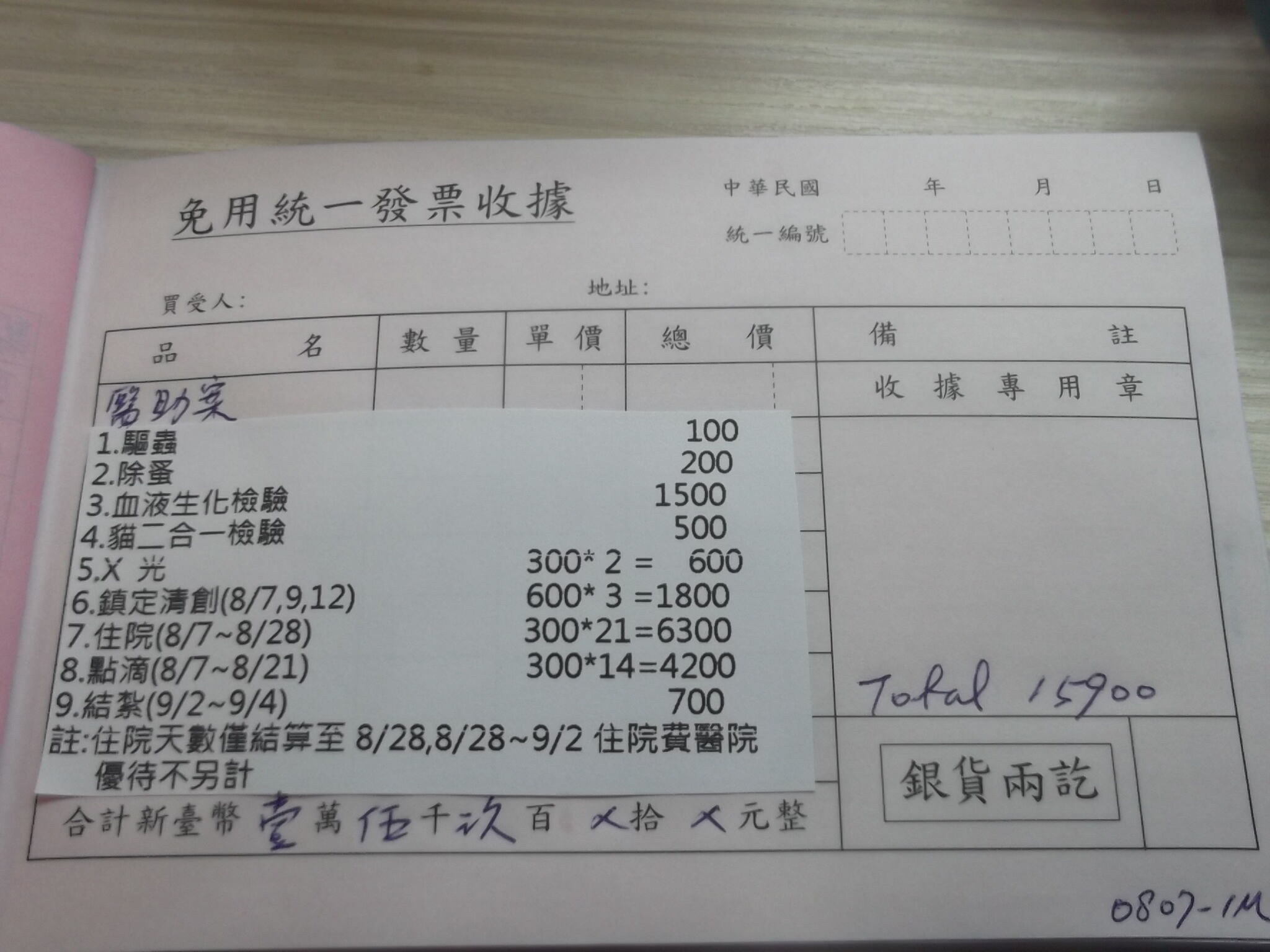 註:住院天數僅結算至8/28,8/28-9/2住院費用優待不另計動物近況說明: 安置在中途友人家,