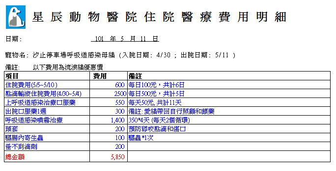 沒想到,貓咪到她家沒幾天就開始打噴嚏,愛媽有跟醫院買藥回家給貓吃. 但狀況時好時壞. 最後貓咪不吃不喝脫水了! 只好送醫治療. 經過點滴輸液.噴霧治療和口服藥後. 貓咪恢復很多,愛媽為了節省醫療費,和醫院拿1週口服藥帶貓咪回家照顧了!