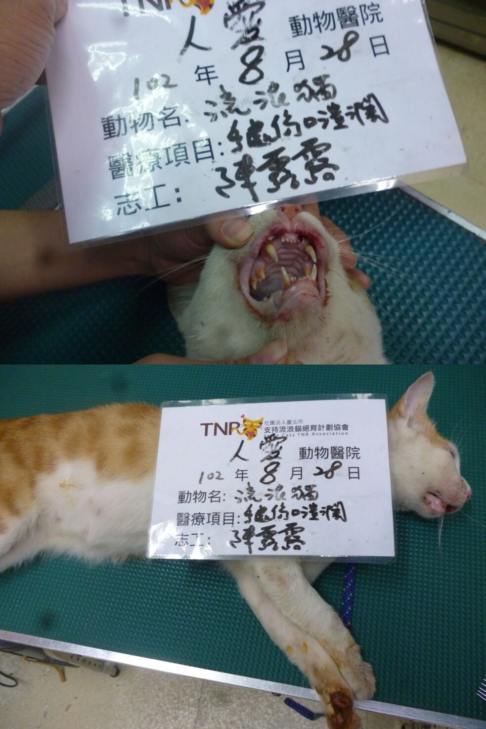 主題: 口腔潰爛出血身上多處外傷的橘子 申請者姓名: 陳露露 花色: 申請日期: 2013-09-21 17:52:44 申請者部落格: 申請者臉書網址: 所在縣市/合作醫院: 高雄市/人愛動物醫院 治療費用: 5760元 需求人數: 6人 已結案 (2014-01-10 18:02:27) 報名人員: JASON(已付款)、JASON(已付款)、yingba(已付款)、凱特(已付款)、Yi-Jun Huang(已付款)、Amber Tsai(已付款)、 候補人員: 動物病情說明: 此貓2個月前來志工餵養區域