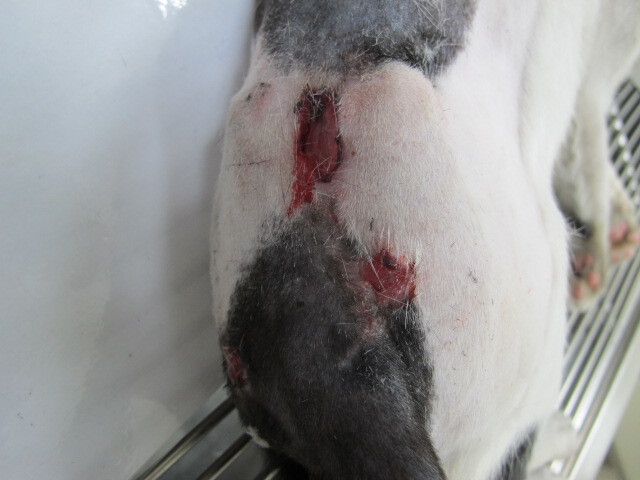 檢查後發現背側有多處穿刺傷、化膿。