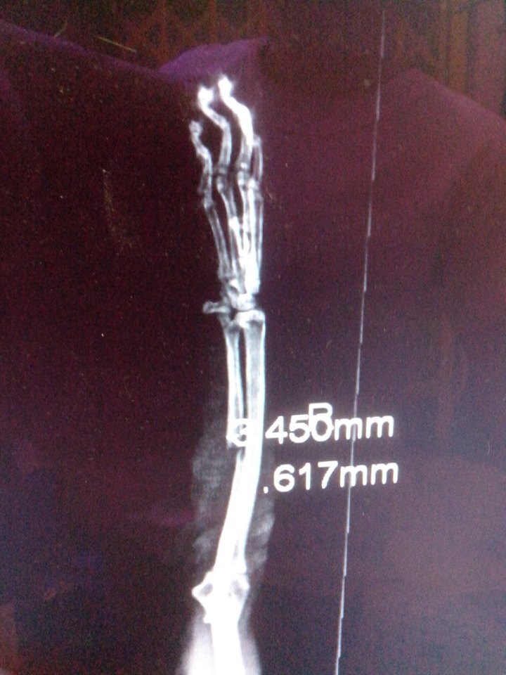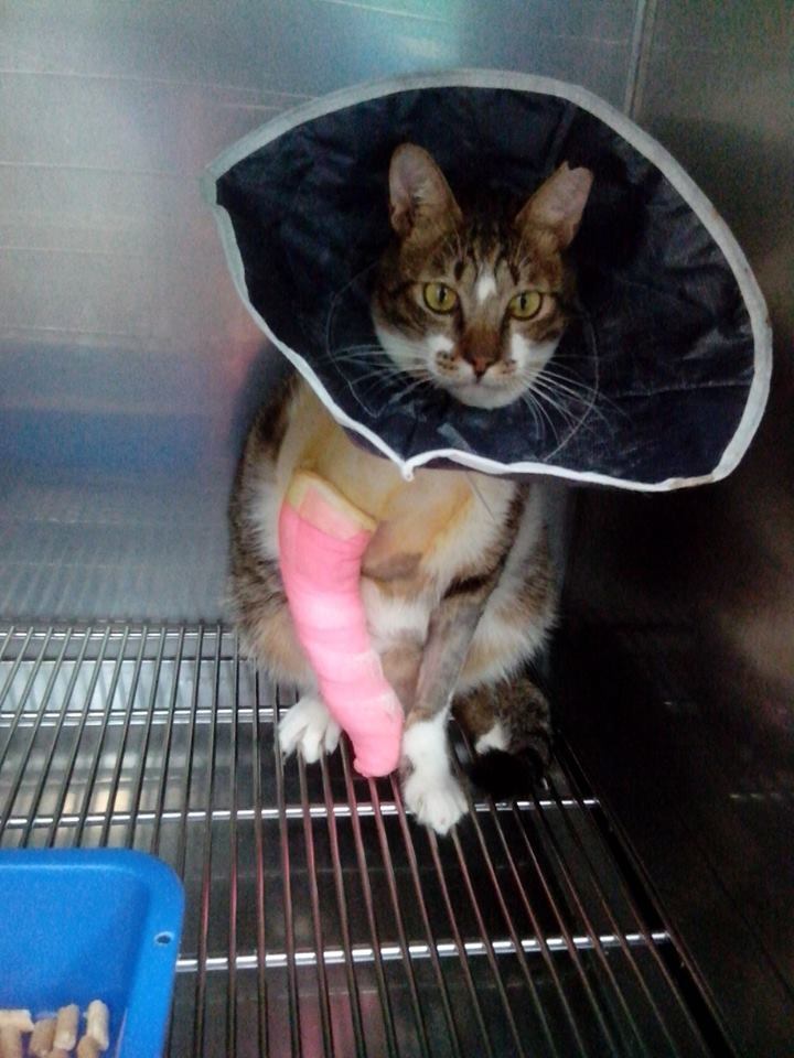 主題: 右前腳骨折的已結紮公貓-抓抓 申請者姓名: 程修芳 花色: 申請日期: 2013-11-02 08:36:06 申請者部落格: 申請者臉書網址: 所在縣市/合作醫院: 台南市/啄木鳥動物醫院 治療費用: 15970元 需求人數: 17人 已結案 (2014-01-10 18:02:14) 報名人員: ChiouYueh Shyu、Hui - Lan Zhuang(已付款)、ERic YU(已付款)、周小蕾(已付款)、WeiLin Chen(已付款)、WeiMin Lin(已付款)、Sky Lin(已付款)、謝小馬(已付款)、00(已付款)、Candace Shiue(已付款)、ginatw(已付款)、Helen Saroja Chen(已付款)、邱小祈(已付款)、nicole chen(已付款)、邱小祈、周星星(已付款)、周星星、Even Chen(已付款)、SASA(已付款)、小可(已付款)、 候補人員: 動物病情說明: 昨日發現自家附近已結紮公貓走路時右前腳一拐一拐的,因為抓抓很親人可以摸,所以大緻摸了一下發現有異樣, 經送啄木鳥醫院拍了X光, 發現右前腳有骨折現象, 需關籠休養,請問我可以申請醫助嗎? 動物近況說明: 經檢測2合一抓抓是愛滋猫, 所以即使固定了腳, 骨頭也沒有自動癒合, 所以必須要打鋼針固定, 目前已完成右前腳骨頭固定手術,已於 11/28日拆線, 在醫院休養.