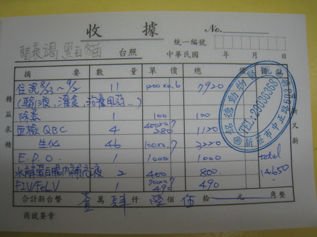 主題: 已當天使的脫水、黃膽並有急性腎衰竭的貓咪 申請者姓名: 鄧伃絜 花色: 申請日期: 2013-09-08 22:34:59 申請者部落格: 申請者臉書網址: 所在縣市/合作醫院: 新北市/銘德動物醫院 治療費用: 14650元 需求人數: 15人 已結案 (2014-01-10 18:01:55) 報名人員: davidlai(已付款)、波波(已付款)、philip(已付款)、Kiki Liang(已付款)、jenny(已付款)、Yuri Chang(已付款)、黃金勇(已付款)、Stacy Wu(已付款)、Ping Meng(已付款)、River Chang(已付款)、李坤財(已付款)、櫻桃桃(已付款)、lavinia x3(已付款)、 候補人員: 動物病情說明: 在平日的餵食區域明志國小附近發現一隻不知哪來的但狀況很不佳的貓咪