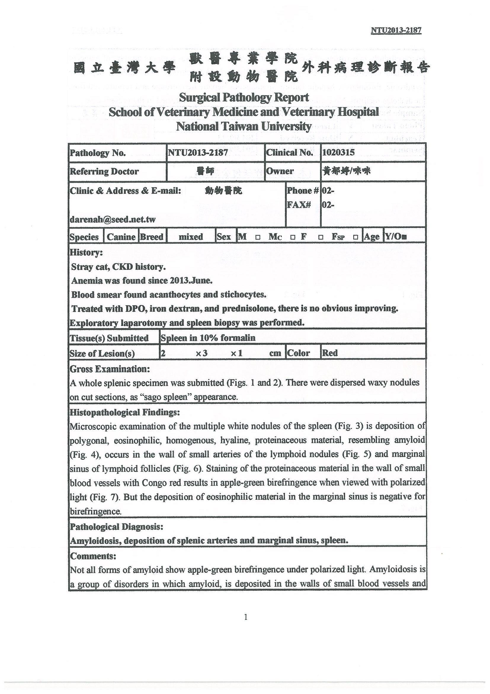 9/30切片報告表示咪咪脾臟為類澱粉沉積症(Amyloidosis)