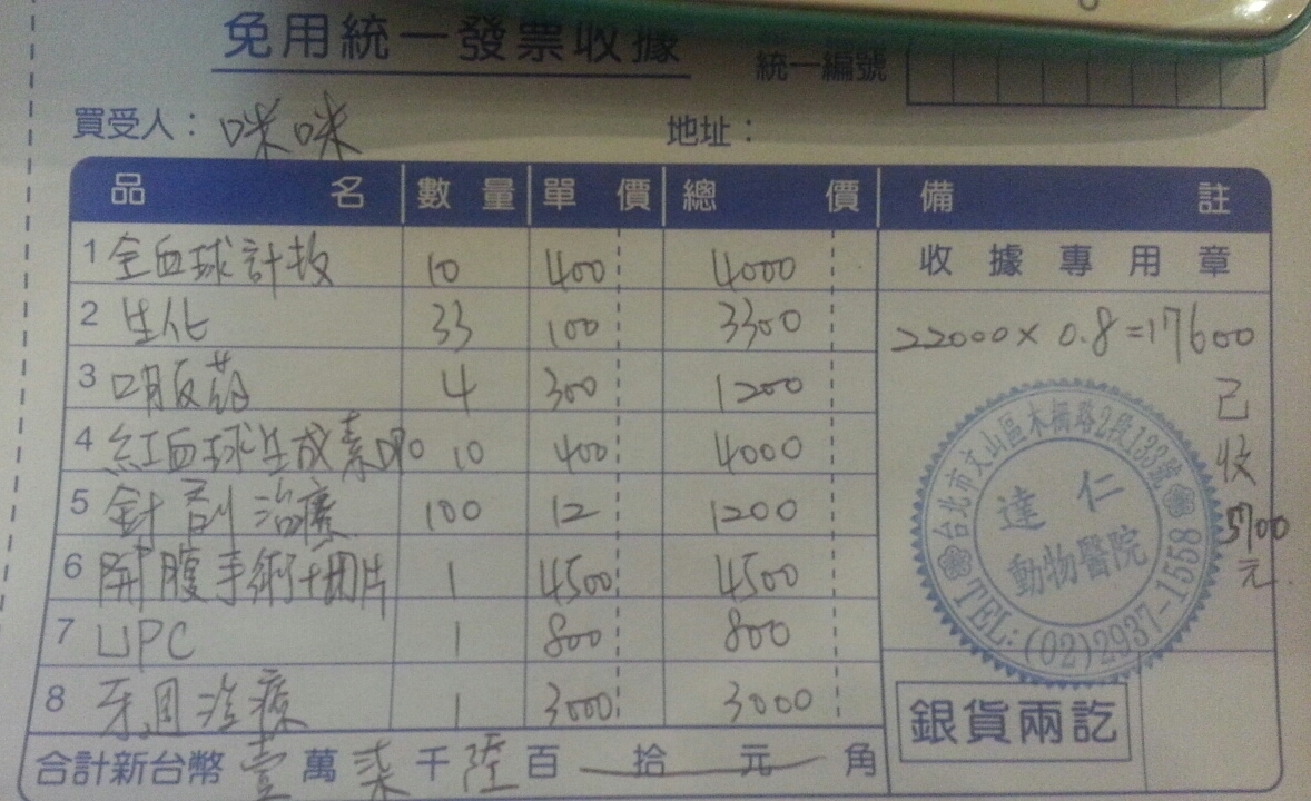 主題: 脾臟炎的腎貓咪咪 申請者姓名: Yu-Ting Huang 花色: 申請日期: 2013-10-30 20:09:42 申請者部落格: 申請者臉書網址: 所在縣市/合作醫院: 台北市/達仁動物醫院 治療費用: 11900元 需求人數: 26人 已結案 (2014-01-10 18:01:52) 報名人員: Hsin-Yi Chiao(已付款)、natsui(已付款)、葉小姐(已付款)、mayshow(已付款)、QQ(已付款)、蔡秀芳、Pewddo Ka(已付款)、Yahui Chung(已付款)、諾麗妹 x12(已付款)、王千枝 x2(已付款)、Bei Bei Wang x2(已付款)、En Rong Shen(已付款)、Drew 酷朱(已付款)、陳珍妮(已付款)、 候補人員: Yu-Ting Huang、Yu-Ting Huang、 動物病情說明: 感謝各位大德對咪咪的第1波醫助