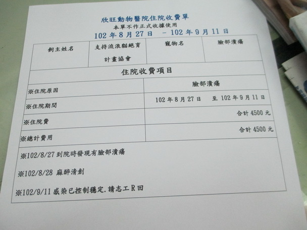 主題: 臉頰嚴重蓄膿貓 申請者姓名: Jessie Tsai 花色: 申請日期: 2013-09-14 13:08:35 申請者部落格: 申請者臉書網址: 所在縣市/合作醫院: 台北市/欣旺動物醫院 治療費用: 4500元 需求人數: 5人 已結案 (2014-01-10 18:01:39) 報名人員: 李小鈴、Cathy25(已付款)、李小鈴、lavinia x2(已付款)、Chen Ping(已付款)、Patrick(已付款)、 候補人員: 動物病情說明: 我要通報安平里南京公寓,這有我餵養浪浪貓咪“小夫”,臉頰明顯腫漲,應該是打架受傷,並已經有蓄膿的現象,因距離眼睛很近,左眼已經睜不開擔心有傷到眼睛
