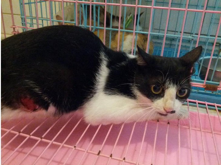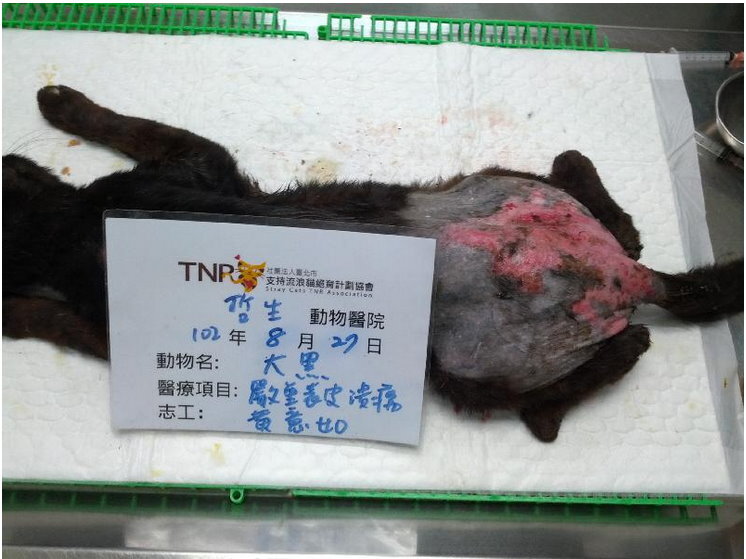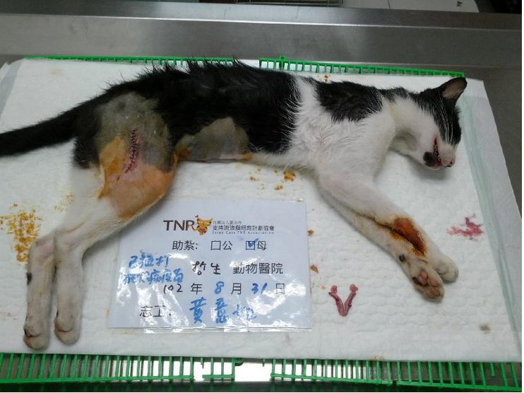 主題: TNR到腿部撕裂傷和背部糜爛的貓 申請者姓名: 黃意如 花色: 申請日期: 2013-09-03 19:12:56 申請者部落格: 申請者臉書網址: 所在縣市/合作醫院: 新北市/哲生動物醫院 治療費用: 3000元 需求人數: 7人 已結案 (2013-09-19 17:52:43) 報名人員: SASA(已付款)、顏廷砡(已付款)、Kate Wang x2(已付款)、周星星(已付款)、ERic YU(已付款)、Jackie Kang(已付款)、 候補人員: 動物病情說明: 新北市淡水區竹圍靠近舊馬偕後門,發現數隻成貓未結紮,避免過度繁殖,加以誘捕結紮。同時施打狂犬疫苗。這隻黑白賓士母貓,身上多處大傷口,緊急做清創縫合手術,同時預計住院治療10天,讓傷口充分復原。