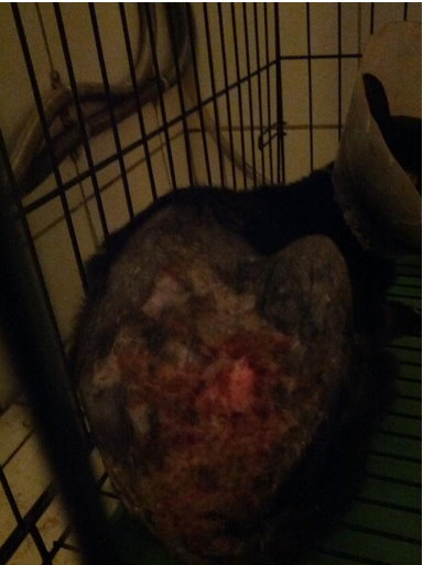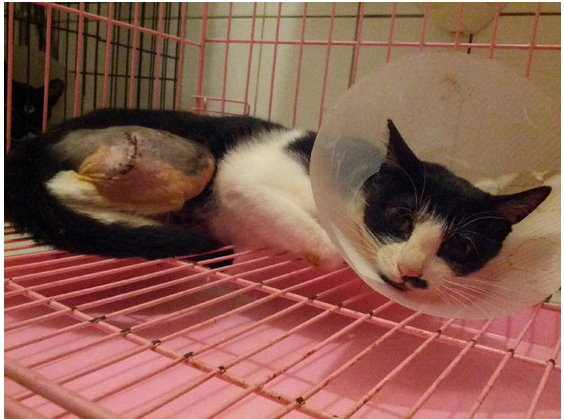這隻大公貓背部靠近尾巴有大面積的傷口,緊急做清創手術,住院兩週,給與抗生素治療。
