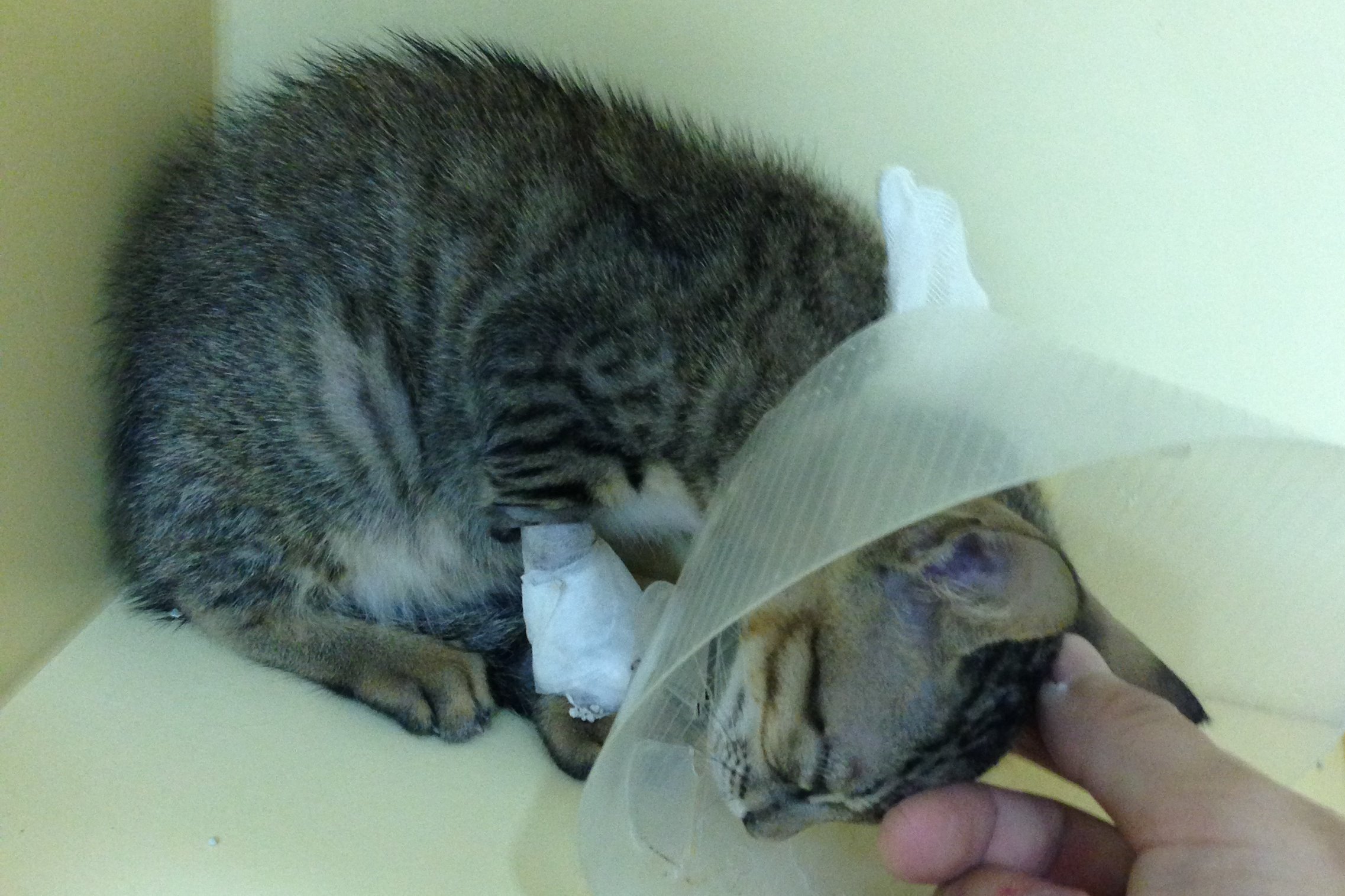 主題: 神經症狀的小虎斑 申請者姓名: 臺北市支持流浪貓絕育計劃協會 花色: 申請日期: 2013-09-03 17:59:23 申請者部落格: 申請者臉書網址: 所在縣市/合作醫院: 台北市/極光動物醫院 治療費用: 8880元 需求人數: 19人 已結案 (2013-09-19 17:52:34) 報名人員: natsui(已付款)、SASA(已付款)、Jackie Kang、周星星(已付款)、lora(已付款)、小麥 x2(已付款)、Klin Pan x2(已付款)、Amelie Shen x2(已付款)、Cathy Kao(已付款)、Maureen Huang(已付款)、ERic YU(已付款)、Jason Chang x2(已付款)、Kiki Liang(已付款)、nai x2(已付款)、caroline(已付款)、 候補人員: 動物病情說明: 小虎斑的媽媽疑似被捕獸夾夾傷,帶著殘肢跟住戶討食,志工接獲通報捕捉送醫,住戶說小貓還有跑出來討食,志工不放心7/12颱風天還到附近查看小貓是否安好,怎知居然被其他住戶補捉放置在沒有遮蔽物的地方淋雨,全身濕淋淋,趕緊帶回協會洗澡除蚤,洗完小貓們都累壞了,疊在一起睡著了,當時體重才四百公克...好不容易照顧到大,打上預防針,本以為就可以奔向幸福...