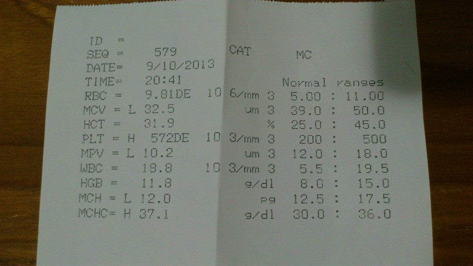 但在1個月療程結束準備原放前驗血(10/1)發現他貧血狀況明顯有改善,但白血球指數過高,醫生表示固定在吃藥且他狀況都很好應該不太可能會有體內發炎狀況,較有可能因緊張導致,為求慎重起見,再讓扮鬼臉多住1周,醫生並更換另種藥給他試試,