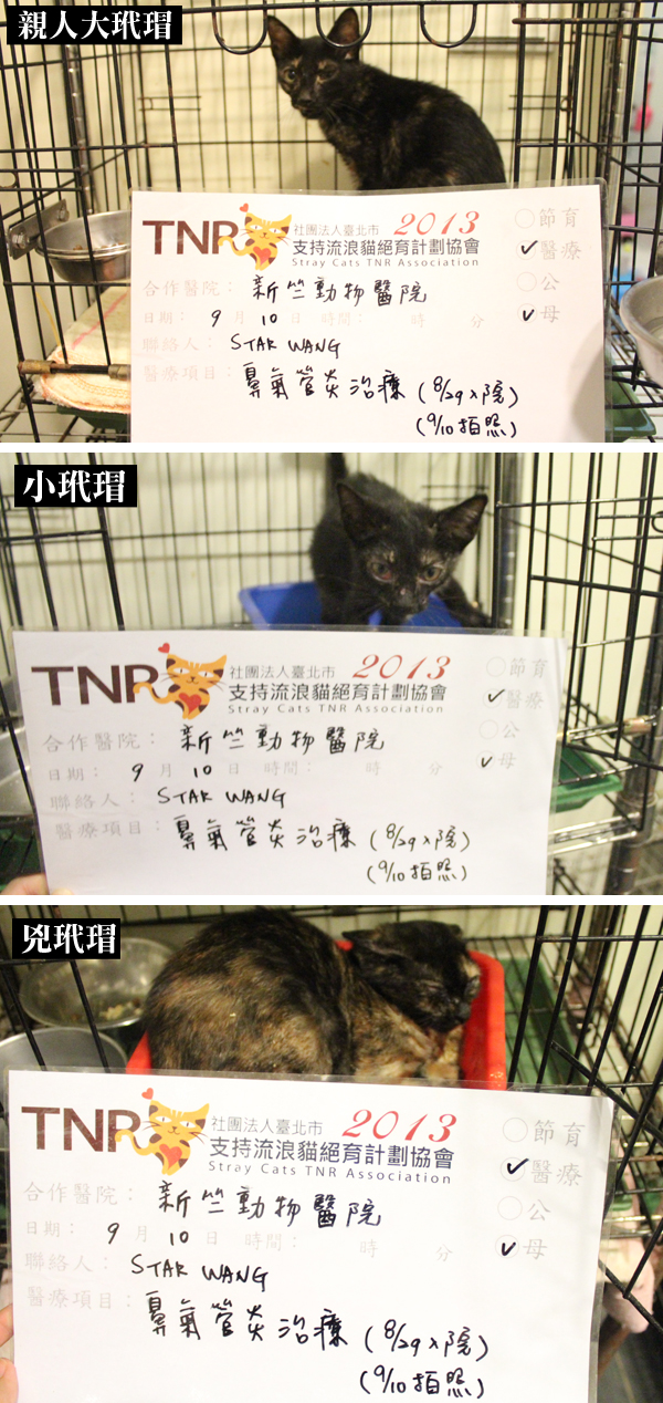主題: 逃過安樂的三隻鼻器管炎小玳瑁 申請者姓名: Star Wang 花色: 申請日期: 2013-09-22 21:10:21 申請者部落格: 申請者臉書網址: https://www.facebook.com/star.wang2 所在縣市/合作醫院: 新竹市/新竺動物醫院 治療費用: 10000元 需求人數: 22人 已結案 (2014-01-10 18:01:28) 報名人員: Ou Han x2(已付款)、Emily Chou x2(已付款)、Nat Niu(已付款)、小麥(已付款)、S-H、鄧茹君(已付款)、Wenhsin Li x2(已付款)、Weiwen Tu(已付款)、WEI(已付款)、Annie Liu x3(已付款)、lunyi(已付款)、Keke Chien、Jhih-juyn Huang(已付款)、Sunny Chen x2(已付款)、April Tsung(已付款)、Layla Hsu(已付款)、Suyi Hsu(已付款)、JO(已付款)、 候補人員: 動物病情說明: 8月29日自南寮收容所c區接出的貓咪,