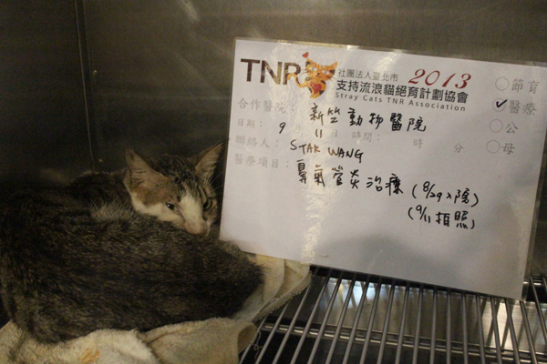 主題: 鼻器管炎到眼歪臉腫的白底虎斑 申請者姓名: Star Wang 花色: 申請日期: 2013-09-22 19:11:16 申請者部落格: 申請者臉書網址: https://www.facebook.com/star.wang2 所在縣市/合作醫院: 新竹市/新竺動物醫院 治療費用: 9900元 需求人數: 20人 已結案 (2014-01-10 18:01:21) 報名人員: Ou Han x3(已付款)、Emily Chou x2(已付款)、Gini Liao(已付款)、pinlun(已付款)、姍珊(已付款)、WEI(已付款)、坑長(已付款)、lunyi(已付款)、Sean Chun-hsiang Yo x2(已付款)、Frannie(已付款)、Kiki Liang(已付款)、Wendy x2(已付款)、Mika Beryl(已付款)、Kate Yu x2、Happy Ho(已付款)、李小鈴、Cynthia Pan(已付款)、 候補人員: 動物病情說明: 這孩子是8月29日在南寮收容所安樂日搶救出的孩子之一,
