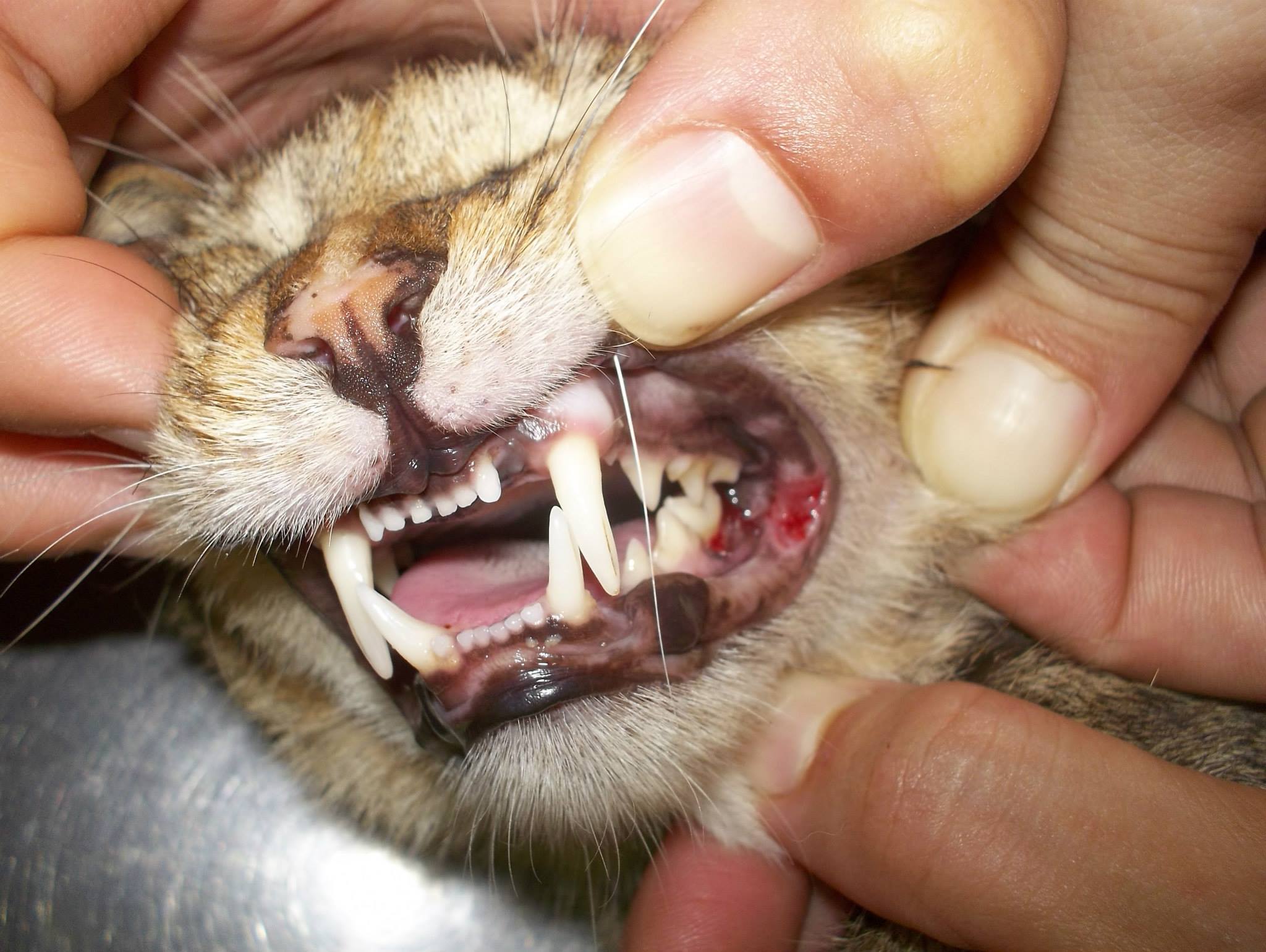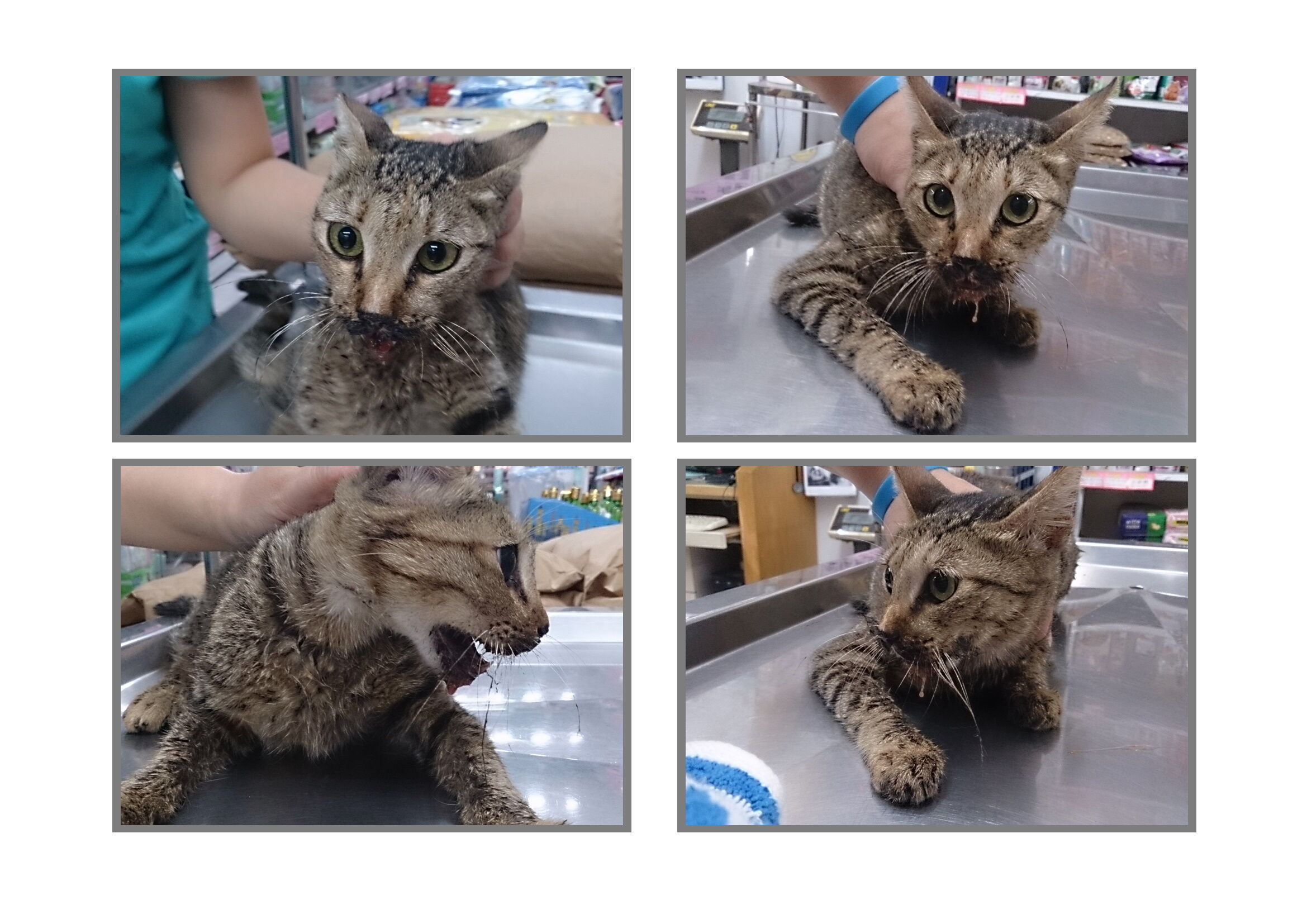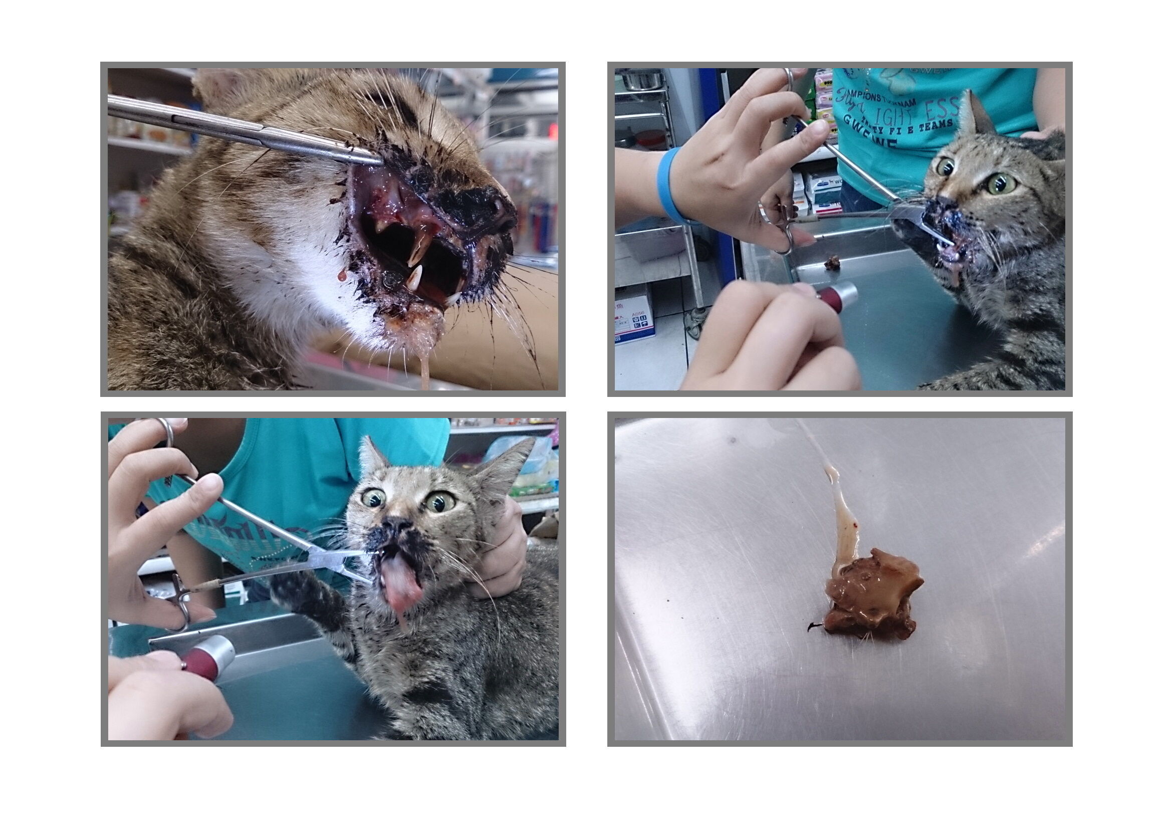 主題: 虎斑母貓口內卡異物(骨頭)造成嘴巴潰爛 申請者姓名: 許桂菱 花色: 申請日期: 2013-09-18 00:10:48 申請者部落格: 申請者臉書網址: 所在縣市/合作醫院: 彰化縣/成愛動物醫院 治療費用: 3020元 需求人數: 4人 已結案 (2014-01-10 18:00:54) 報名人員: 王慧君(已付款)、sharonhuang9(已付款)、李子均(已付款)、Sophie、Ou Han(已付款)、 候補人員: 動物病情說明: 已進行結育志工固定巡視的街貓區域,餵養的阿嬤告知此母貓幾天嘴巴有異狀!想吃東西卻吃不了,且流口水有惡臭,當日此貓也出現,因不兇悍即徒手抓送醫院,醫生當下認定是口腔卡異物!馬上檢查口腔,立即夾出碎骨,因口腔傷口潰爛,進一步做清創治療!且也無法自行進食,住院前兩天只能灌餵泥食,經過10天治療傷口已大致療癒!並施打狂犬疫苗R回原地!