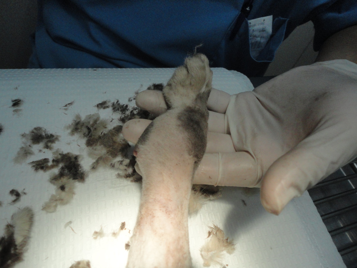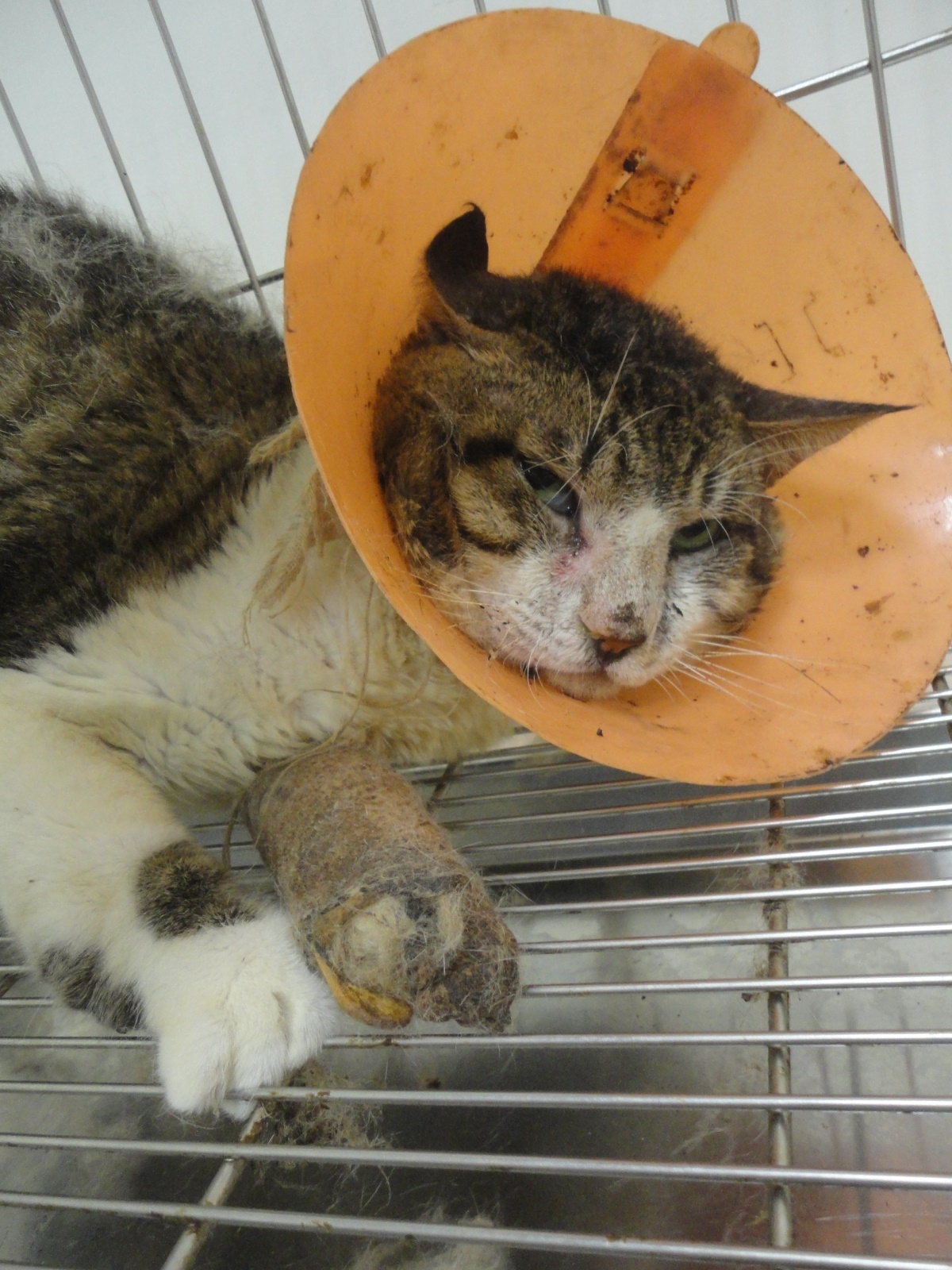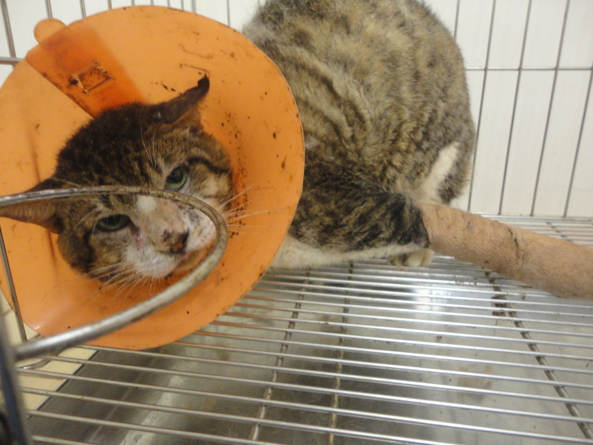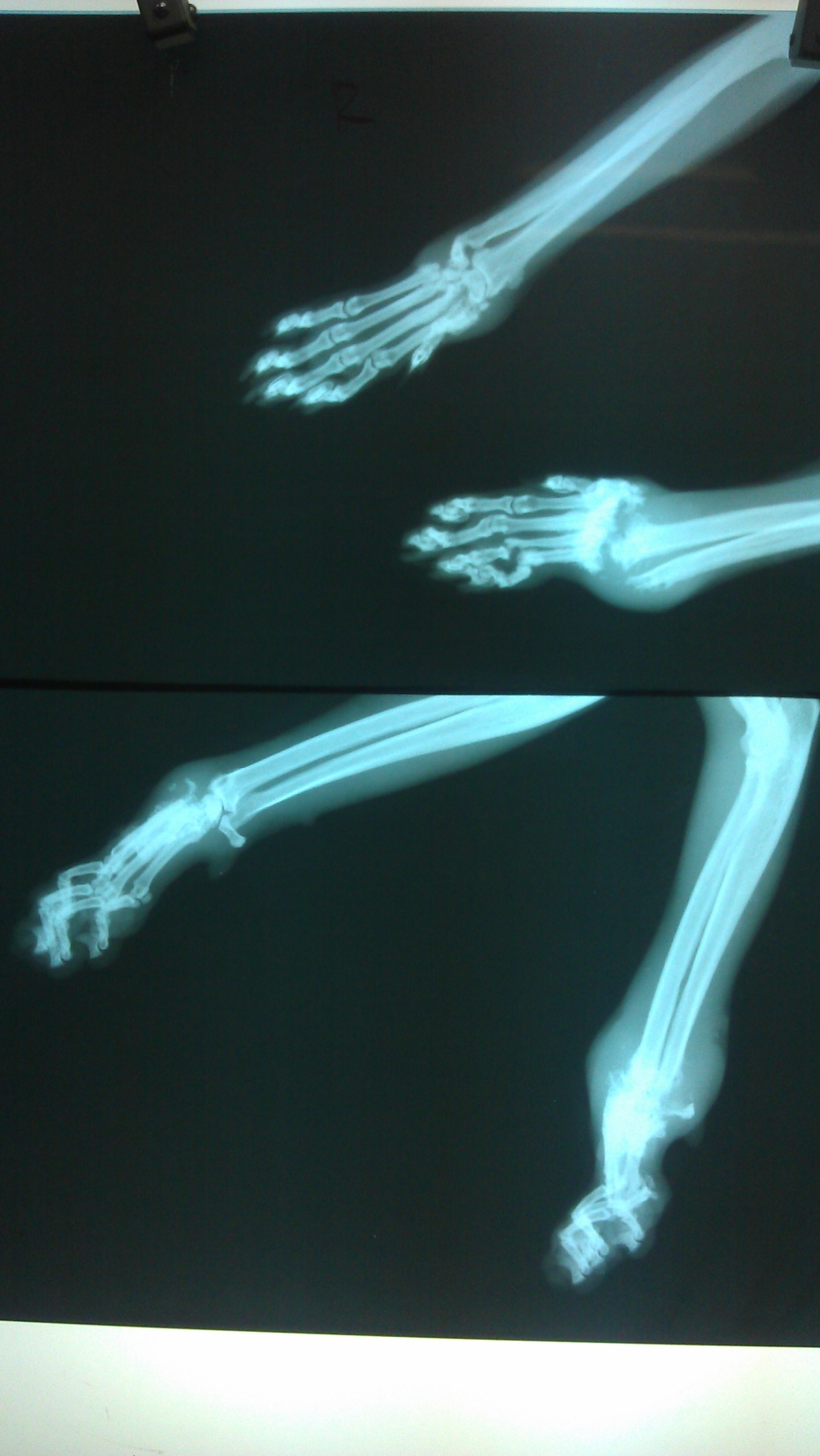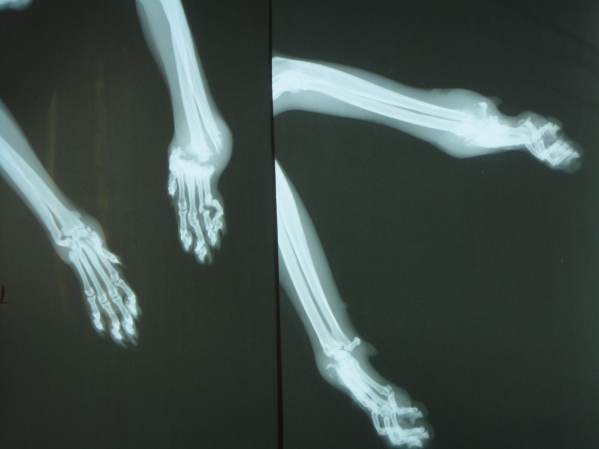 經聯絡由志工張先生協助,在兩天後捕捉,送醫檢查發現前肢疑似骨折,前肢x光片顯示左前肢腕骨已完全被蝕骨細胞破壞吸收,結構完全破壞,評估可能無法保留,右前肢部份趾骨及腕骨亦因骨折而遭破壞, 但大致結構仍完整,為了日後貓咪的生活品質著想,我們以保住貓咪雙腳為努力的目標,經過四個月漫長的醫療,貓咪的腳得以保存,雖然不會像正常貓那樣靈活,但行動自如,也由附近愛心人士照顧中,很感謝醫師大力幫忙,在醫療費用上給予極大的優惠。