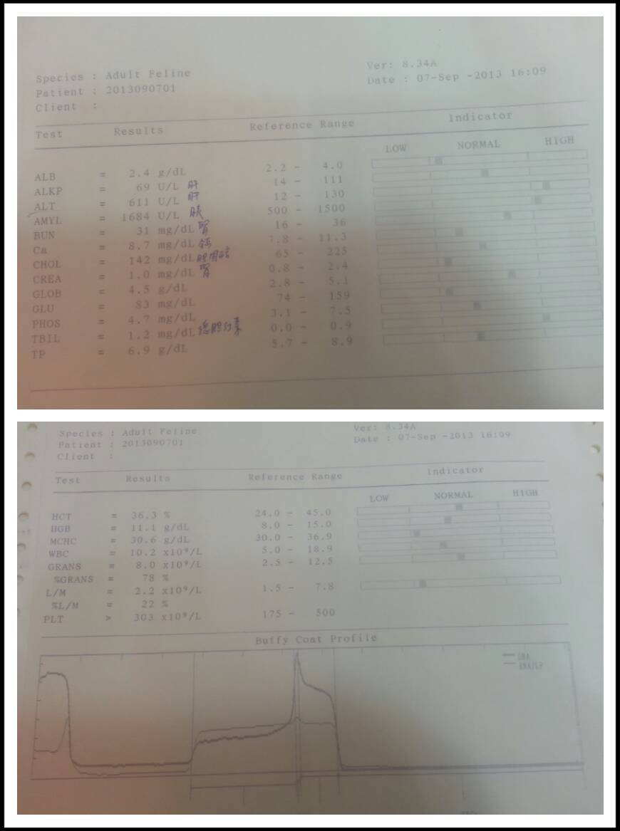 主題: 極瘦的路倒黑貓需要大家的幫忙 申請者姓名: 邱依如 花色: 申請日期: 2013-11-11 00:01:24 申請者部落格: 申請者臉書網址: 所在縣市/合作醫院: 台中市/崇德動物醫院 治療費用: 11800元 需求人數: 13人 已結案 (2014-01-10 18:00:38) 報名人員: 周先媛 x2(已付款)、Michelle Lin(已付款)、cafeyi(已付款)、Kiwee Chou(已付款)、Stephen(已付款)、nicole chen(已付款)、grace0710 x3(已付款)、Bella(已付款)、Yachun Zhan(已付款)、Tiffany Shen(已付款)、 候補人員: 動物病情說明: 這隻黑貓是我家新來的食客,大約來了三四週,剛開始看到他,他會躲在角落對人喵喵叫討食物,但是不能接近,媽媽每天餵食,終於能親近人,但因為貓咪實在太瘦了所以不敢馬上帶去結紮!就在9/7中午,看到貓咪躺在我家機車旁奄奄一息,不管我怎麼摸他移動他,他都無力反抗!於是情急之下就快點送往醫院!到醫院後經過醫生檢查後,發現黃疸很嚴重,於是做了13項生化檢驗與血檢! 動物近況說明: 9/7因為當時貓咪血管脆弱打不到,所以先給皮下點滴,加上投藥後已恢復進食喝水,所以就沒打點滴了!且那天我有在醫院陪著貓咪到晚上,確定了他開始進食喝水後我才放心離開!當時貓咪到醫院才3公斤(他是大公貓的體格喔)!