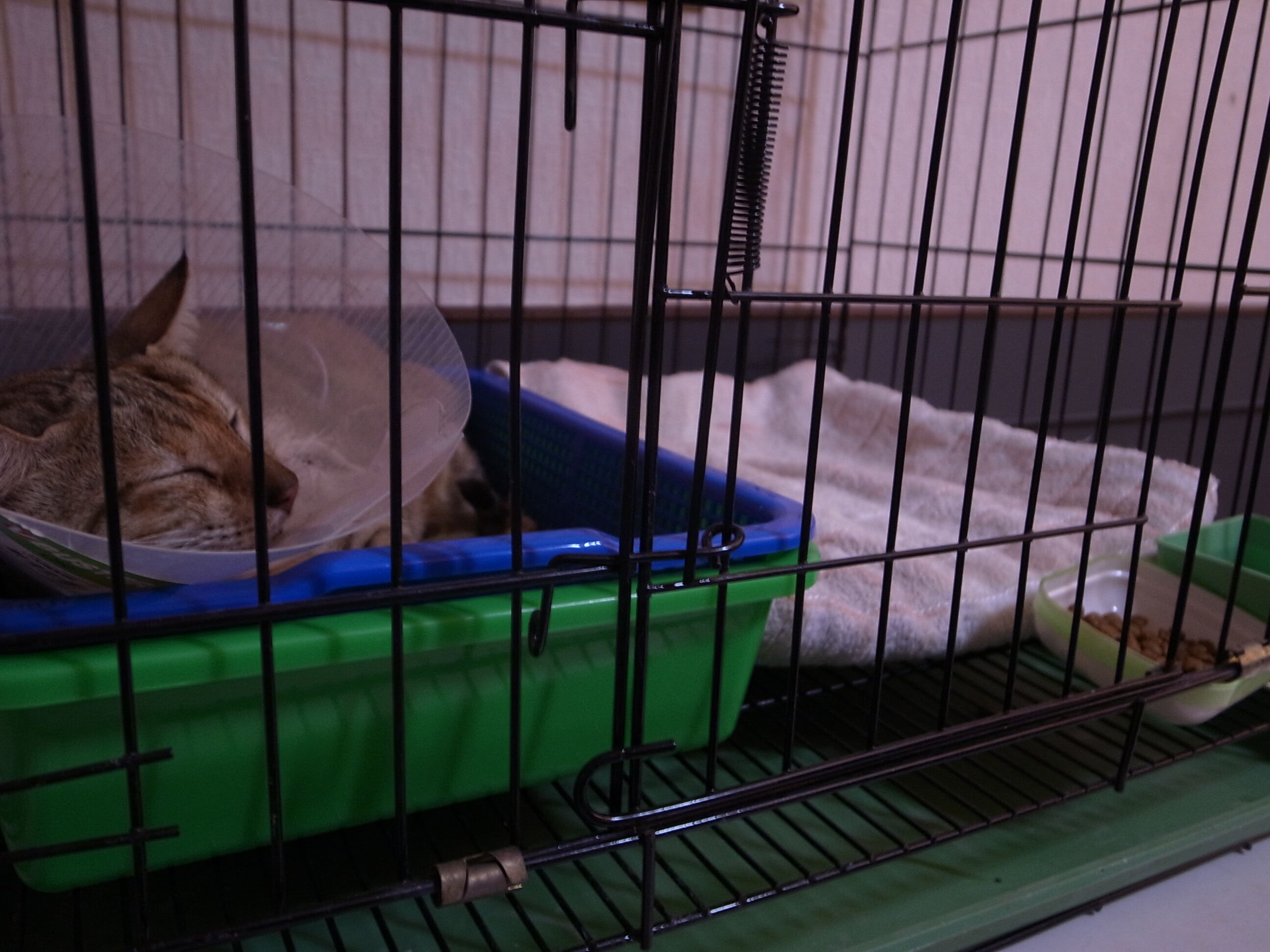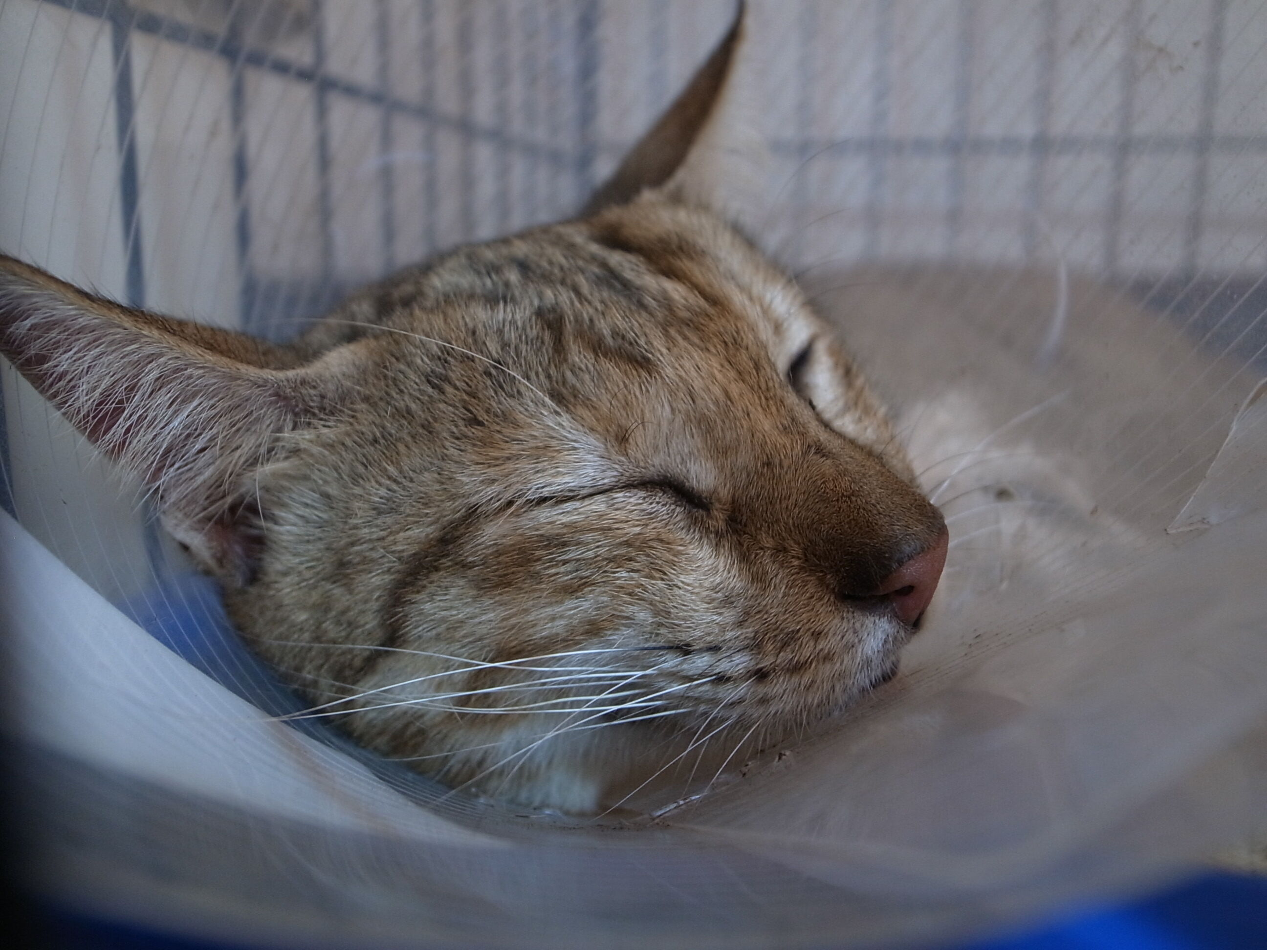 餵完狗狗後我觀察了貓咪的狀況,有兩隻像是有上呼吸道感染的現象,其中一隻還是個成母貓,一直在咳,全都未結紮。考量到颱風將至,得先誘捕母貓加一隻眼睛比較嚴重的幼貓送醫治療。