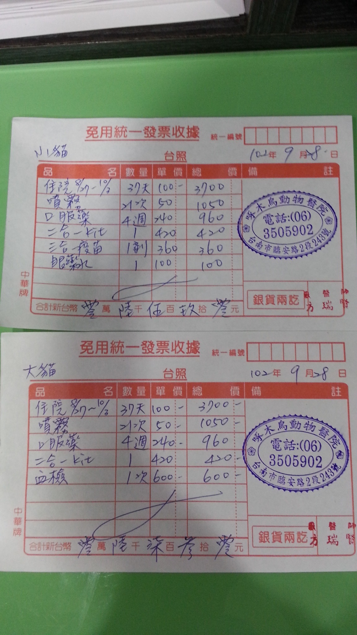 ps. 其他貓咪我有回去探視過一次,狀況大致良好無再生病,日後有空會再回去探視看看。動物近況說明: 0/3 接兩貓出院並回家中途 ; 母貓剛結紮完身體很虛弱,食慾還未恢復,但有喝水,也定時吃消炎藥。小貓的眼睛幾乎都好了,已是水汪汪大眼,還是會有些緊張但是非常黏人,很喜歡人抱抱摸摸。驅蟲除蚤三合一第一劑施打完成,再過幾天即可開放認養。母貓恢復後也會幫溫柔的她尋找好人家送養∼∼∼:D