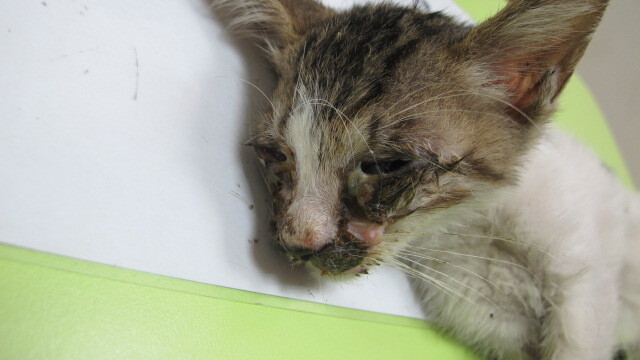 醫生檢查斷定為脫水嚴重虛弱,雙眼鼻感染嚴重分泌物多,已有化膿狀況.