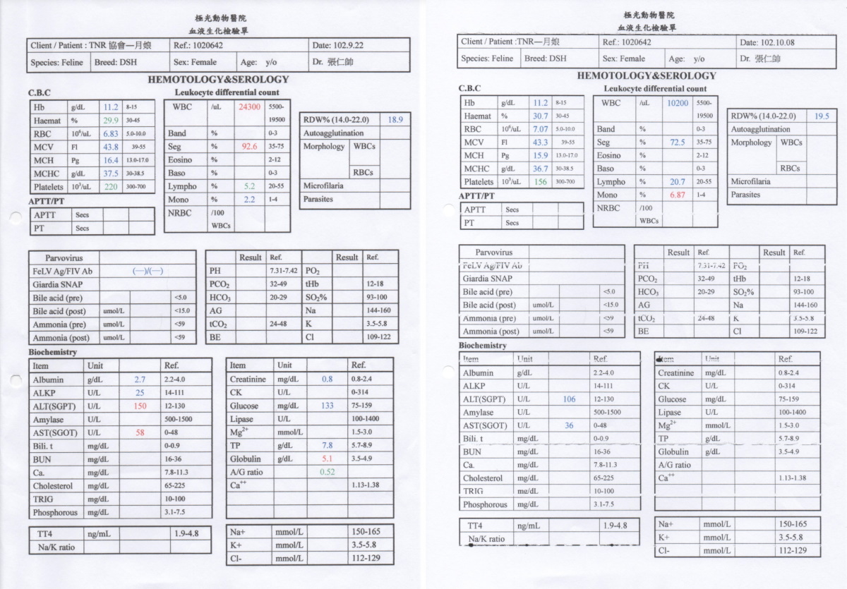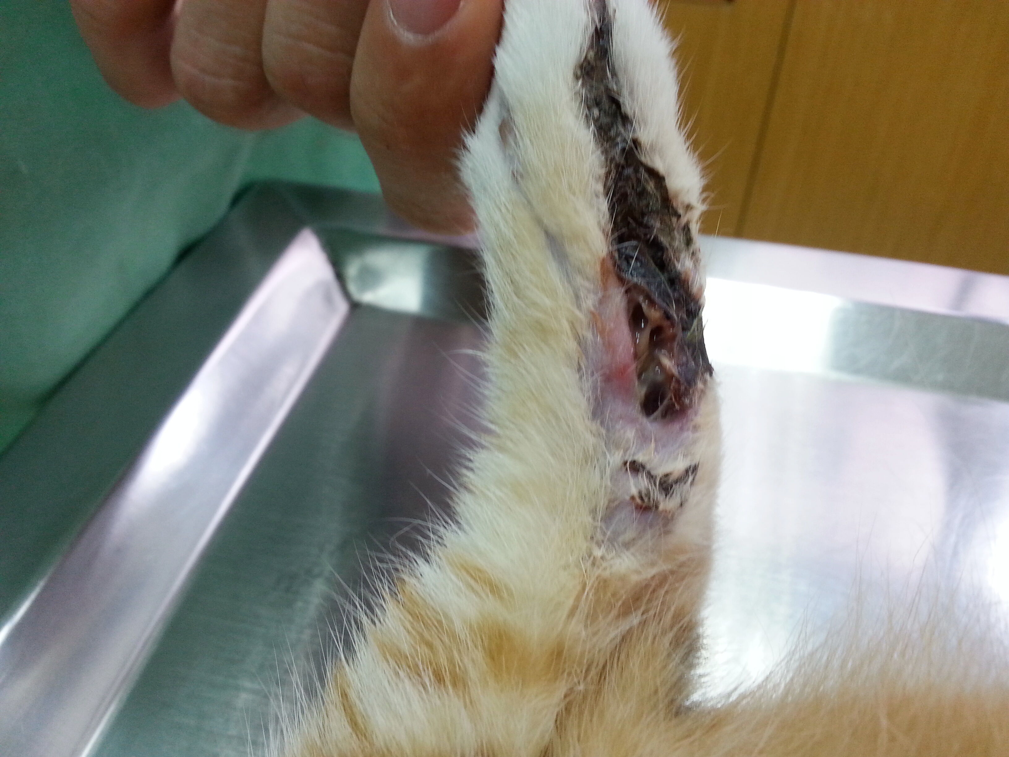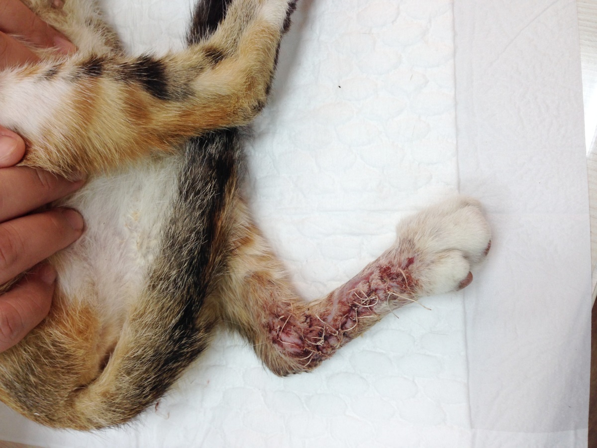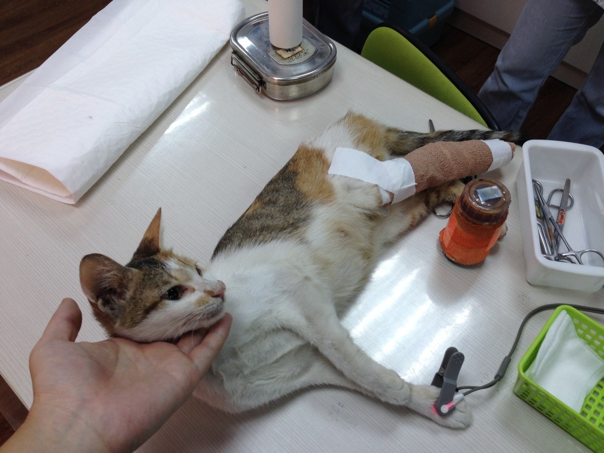 主題: 右後肢壞死母貓 申請者姓名: 張嘉盈 花色: 申請日期: 2013-10-24 10:53:10 申請者部落格: 申請者臉書網址: 所在縣市/合作醫院: 台北市/極光動物醫院 治療費用: 24160元 需求人數: 26人 已結案 (2014-01-10 17:59:18) 報名人員: Kay Wang(已付款)、connie242(已付款)、Shirley Tsai(已付款)、Kim Meng(已付款)、lin789 x2(已付款)、傻傻(已付款)、葉孟銀、葉孟銀、李玉君(已付款)、林琦(已付款)、Yen-Yuan Wang(已付款)、jiajia(已付款)、Kuen-Lin Tsai(已付款)、謝佩芳(已付款)、小娃(已付款)、Ou Han(已付款)、Leah(已付款)、夏元貞(已付款)、姆姆(已付款)、Nico Ting(已付款)、Lucia Tian(已付款)、Yu(已付款)、芸芸(已付款)、白白(已付款)、吉布弟(已付款)、purism(已付款)、蘇花(已付款)、 候補人員: 動物病情說明: 中秋颱風發現母帶子,母貓跛腳且右後肢有開放傷口已化膿,已先緊急帶至醫院清創縫合,但右後肢呈紫色且非常腫脹且冰冷,醫師表示若嚴重須截肢,因此轉向協會求助幫忙轉院,當天血檢白血球偏高,腳太過腫脹,醫師把縫線拆掉兩針,讓皮膚不要那麼緊繃,並給予抗生素治療,所幸恢復狀況良好,已接回照顧。