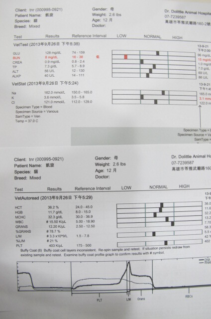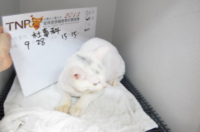 主題: 在地上打滾的貓咪 申請者姓名: 許秀青 花色: 申請日期: 2013-09-30 09:52:58 申請者部落格: 申請者臉書網址: 所在縣市/合作醫院: 高雄市/恩澤動物醫院 治療費用: 9550元 需求人數: 10人 已結案 (2014-01-10 17:59:06) 報名人員: Kim Meng(已付款)、ERic YU(已付款)、Patrick(已付款)、詩詩(已付款)、hero178(已付款)、紅色柚子(已付款)、Nix Lin(已付款)、吳毓軒(已付款)、SASA(已付款)、黃小歐(已付款)、 候補人員: 動物病情說明: 去公園溜狗時發現一隻在地上痙攣打滾的貓咪…因為颱風來了不忍心讓牠在公園淋雨所以趕緊送的杜專科做檢查醫療,檢查結果貓咪的眼睛已喪失功能,下巴有舊傷導致無法進食,有腦傷的現象 動物近況說明: 貓咪的眼睛確定喪失功能,現在嘴巴可以微張30度緩慢進食(雞肉泥或泡軟的乾糧),但走路無法保持平衡,貓咪的狀況無法原地野放,已接回家中照顧