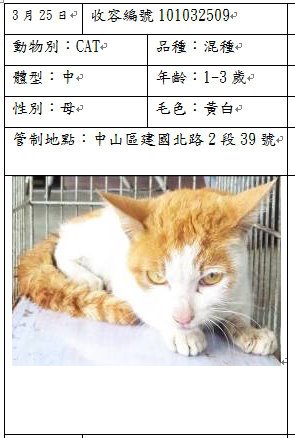 主題: 醫助:暴瘦1.7公斤的流產黃白母貓 申請者姓名: 陳怡靜 花色: 申請日期: 2012-05-14 21:49:42 申請者部落格: 申請者臉書網址: tammyjing1@hotmail.com 所在縣市/合作醫院: 台北市/澄毅動物醫院 治療費用: 4650元 需求人數: 6人 已結案 (2013-02-23 14:55:37) 報名人員: KK(已付款)、kuang(已付款)、蔡甫(已付款)、gina(已付款)、潘逸群(已付款)、李子均(已付款)、 候補人員: 小舟、小舟、 動物病情說明: 救援隊帶回暴瘦1.7公斤的成貓,嚴重脫水失溫,到院只有35度,血檢都正常除了肝指數高,但有可能跟過瘦有關,檢驗為愛滋貓,經搶救已回溫,當天自己吃了兩個罐頭,很年輕的貓,雖然很虛弱但還是狠咬了醫師,看起來求生意志很強,上點滴進食後精神好多,隔天流產排出未成形死胎,之後食慾和胃口都很好脫水改善,養胖到2.3公斤進行結紮,目前還在中途家養胖胖。