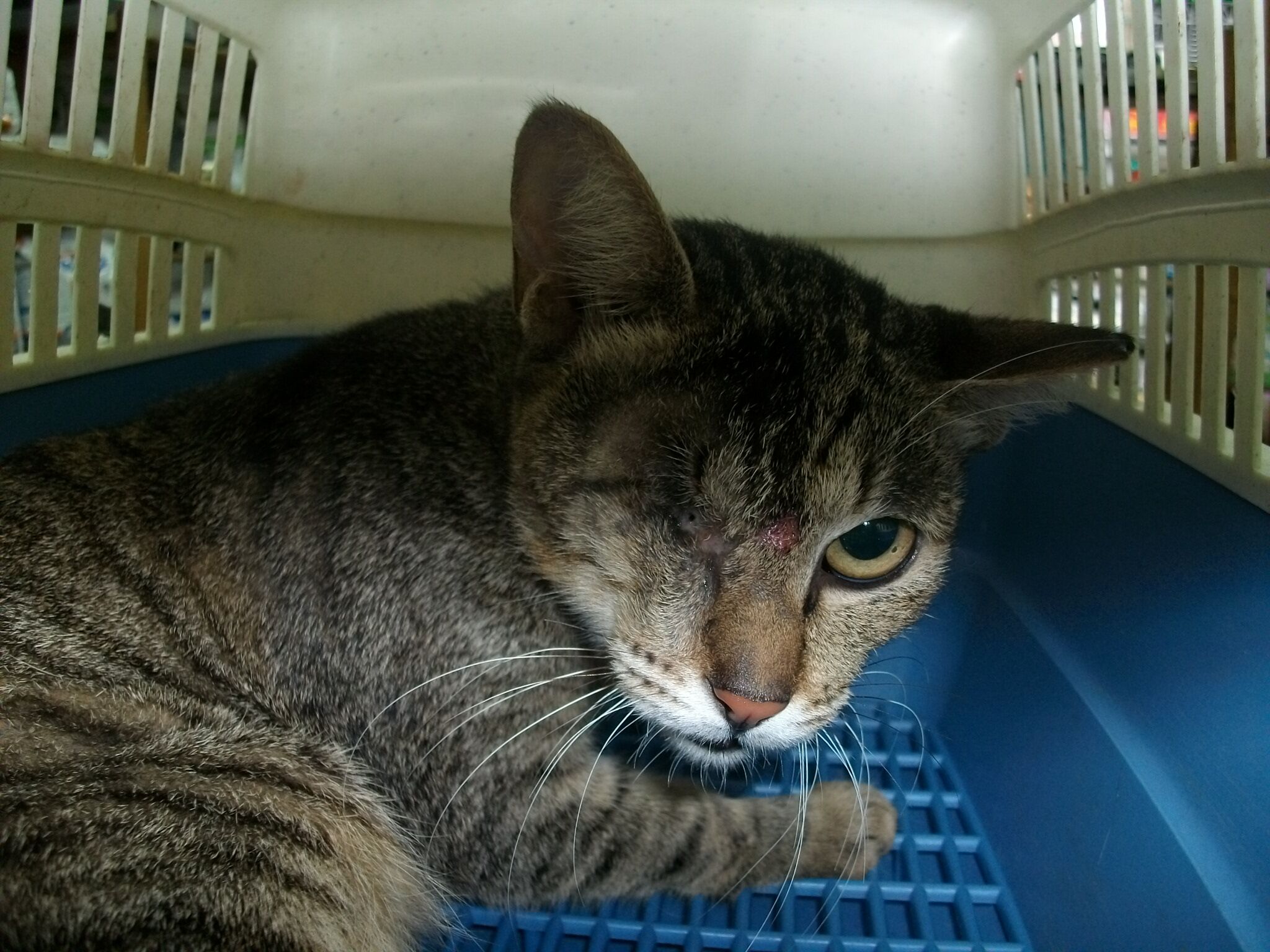 主題: 摘除右眼 申請者姓名: 李筱薇 花色: 申請日期: 2013-10-17 23:17:27 申請者部落格: 申請者臉書網址: 所在縣市/合作醫院: 台北市/文心動物醫院 治療費用: 4000元 需求人數: 5人 已結案 (2014-01-10 17:59:00) 報名人員: Jason Chang(已付款)、曹小文(已付款)、潘逸群(已付款)、Choco Chen(已付款)、Bella Hung(已付款)、 候補人員: 動物病情說明: 要抓牠結紮過程中,大力撞擊誘捕籠,導致已受傷的右眼流血,傷勢嚴重。 動物近況說明: 近期又因為一直衝撞,導致眼睛跟額頭又受傷,病情穩定後於10/17出院 共住院20天。