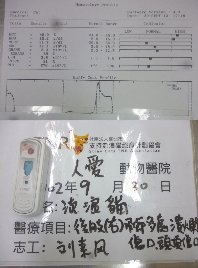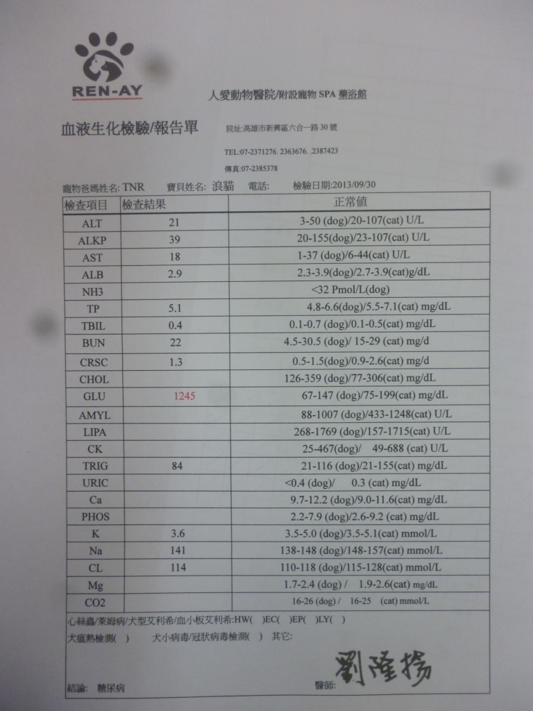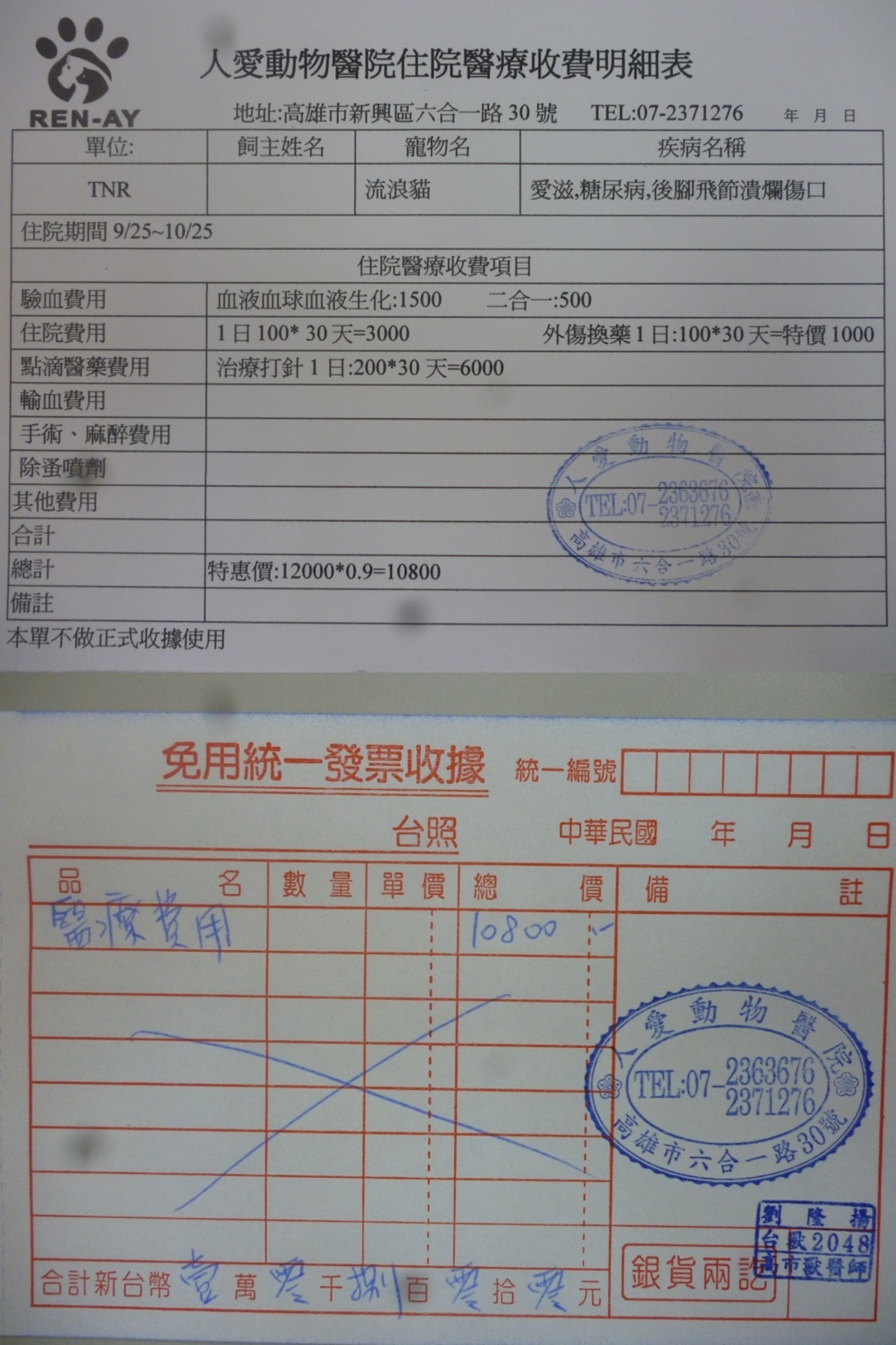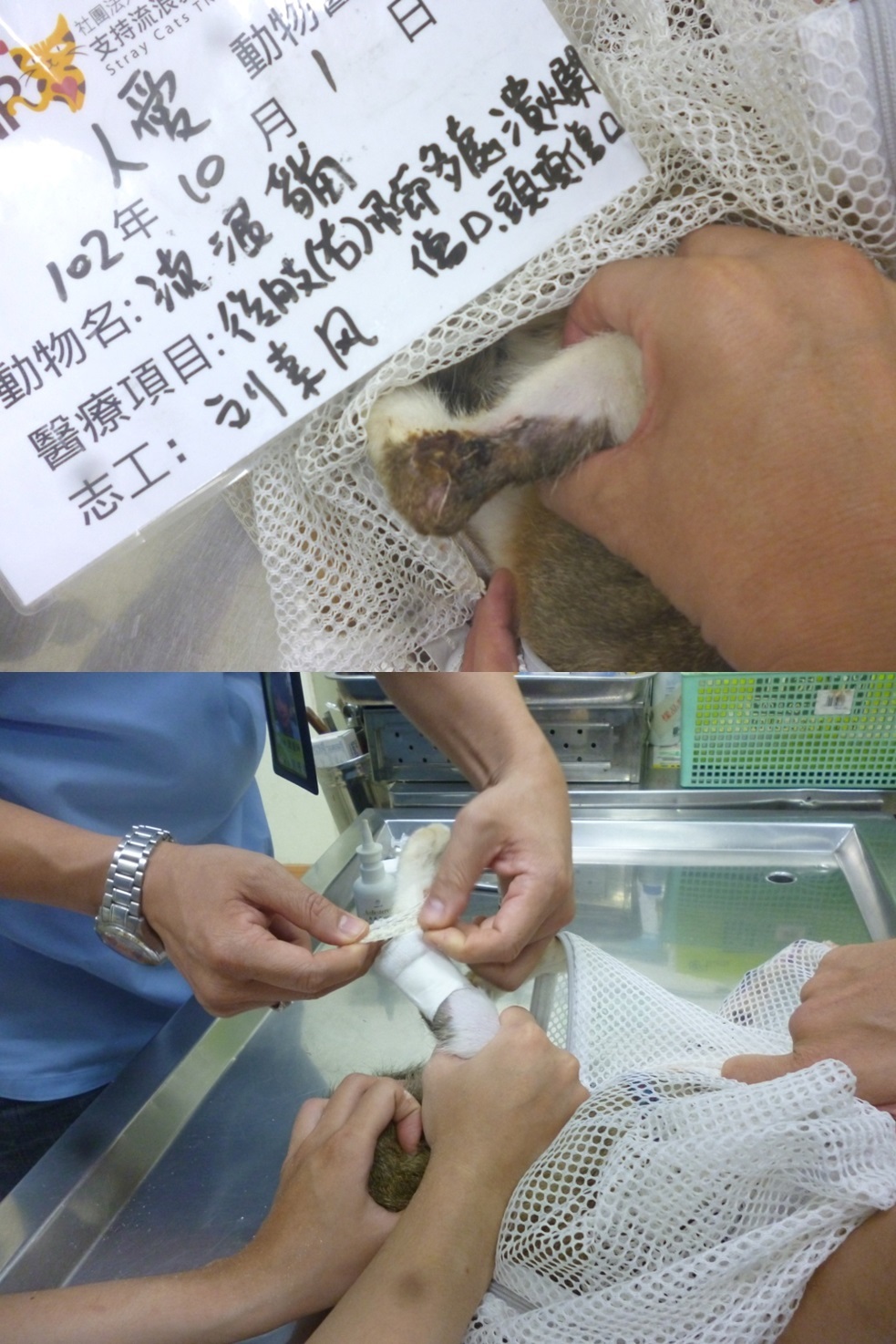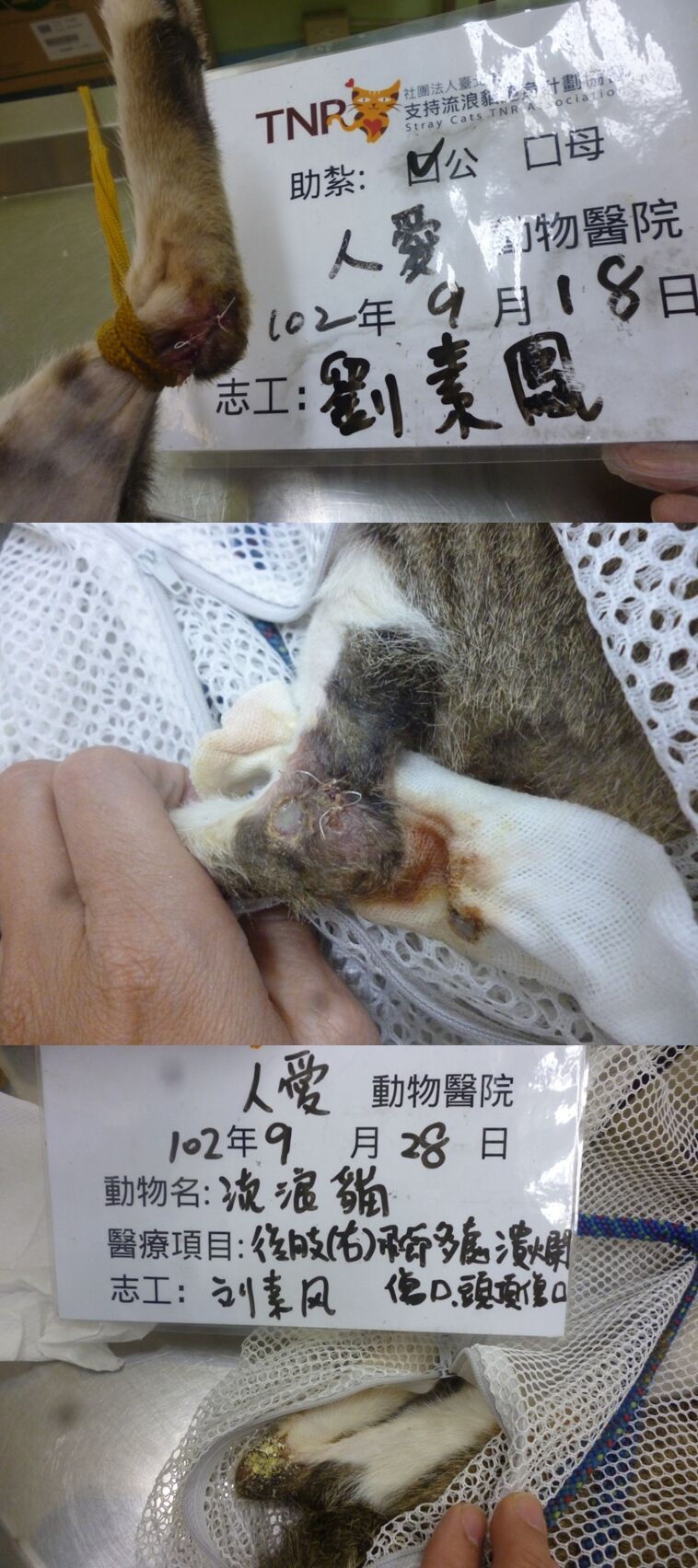 主題: 民族路巷子傷口不痊癒的貓咪 申請者姓名: 劉素鳳 花色: 申請日期: 2013-10-30 11:09:47 申請者部落格: 申請者臉書網址: 所在縣市/合作醫院: 高雄市/人愛動物醫院 治療費用: 10800元 需求人數: 12人 已結案 (2014-01-10 17:58:50) 報名人員: 葉小姐(已付款)、王千枝 x2(已付款)、王千枝(已付款)、Amber Tsai(已付款)、Jason Liu(已付款)、ERic YU(已付款)、周小蕾(已付款)、Aki Tang(已付款)、lavinia x3(已付款)、 候補人員: 動物病情說明: 這隻貓咪是9/18日到醫院結紮的大公貓, 當時發現除了頭頂有打架傷口~四肢還有多處傷口~需要縫合~可能是打架造成的, 結紮時有申請1000醫療, 原本幫他縫合醫生要讓他住幾天到傷口好了就可以原放, 但一週過去10/25人愛助理告知治療下來覺得傷口癒合狀況不是很好~也有可能還有其他併發症例如糖尿病之類~導致傷口復原不易~所以開始申請醫助並幫持續住院治療~ 後來驗血結果~血液部分除了血液濃度較高之外,.白血球指數也是OK的~表示傷口發炎早已獲得控制~而生化部份除了血糖很高~其他都是在正常值~二合一部份FIV(愛滋)出現淺淺的藍色.所以表示傷口不易痊癒跟高血糖和愛滋有絕對關係~左後腳關節處潰爛雖然每天打胰島素+消炎針+換藥~但由於傷口在關節常常磨擦的地方~加上還有愛滋&糖尿病~對原本已經很難癒合的傷口雪上加霜~ 動物近況說明: 經過一個月的努力目前傷口只剩一點點. 目前先帶回至中途觀察照顧~醫生也特別叮嚀還是要注意傷口變化~離開消炎針~傷口就有發炎惡化的可能~所以會多加留意喔~ 貓咪這樣的狀況下不能原放, 目前就安置照顧喔.