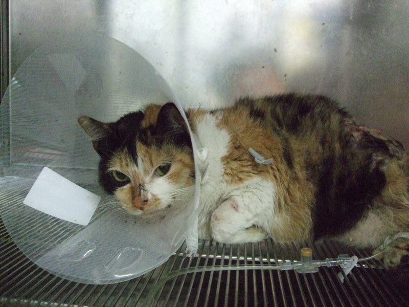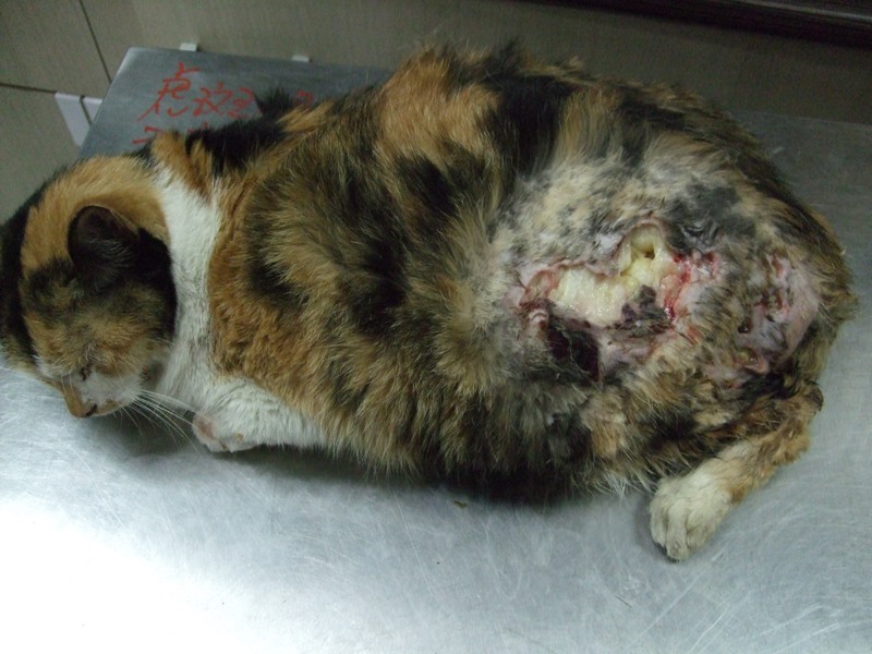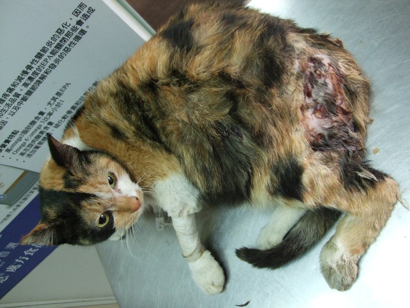 今年2/28牠發生車禍,愛媽發現送往醫院後已是失溫、血壓也量不到,完全沒有血色。傷口都是汙泥及髒水。雖然傷口每天持續清創及保溫,但貓咪一直沒有胃口,身體狀況也就持續變差。第五天醫師檢查發現胰臟炎和貧血,開始進行輸血,同時插鼻胃管進行灌食。最後併發呼吸道疾病,鼻膿、眼膿,進而出現呼吸困難。大約一個禮拜貓咪往生了。