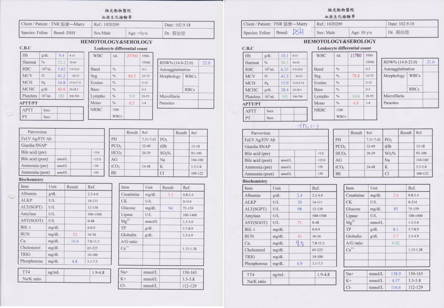 最近MARY出現食慾不振的狀況,吃東西好像會疼痛,送醫檢查,牙齦紅腫發炎,先服用抗生素和類固醇,狀況改善有限,但體重下降幅度增大,精神越來越差,考慮MARY有腎衰竭還有愛滋免疫力不好,手術洗牙、拔牙有一定的風險,超音波檢查發現腎臟情況還好,但心臟循環不好,血壓過高,綜合評估怕越拖狀況越嚴重,手術風險會增大,於進行手術,術後恢復狀況良好,又開心的大吃大喝。