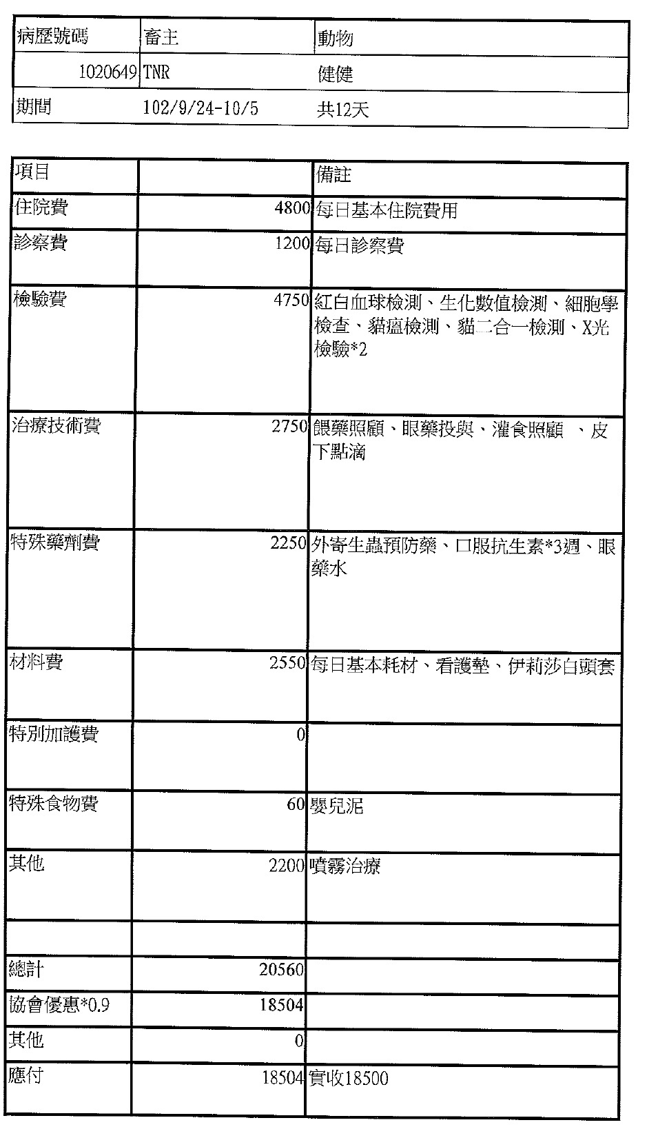 總醫療費用=18500+2400(檢驗費)=20900