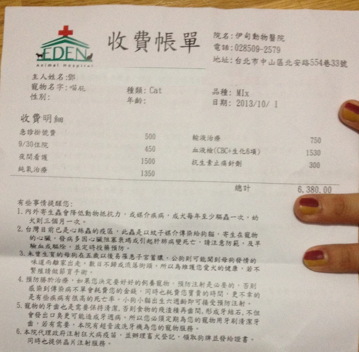 夜深已將小椰子送至24hr營業大直的伊甸動物醫院