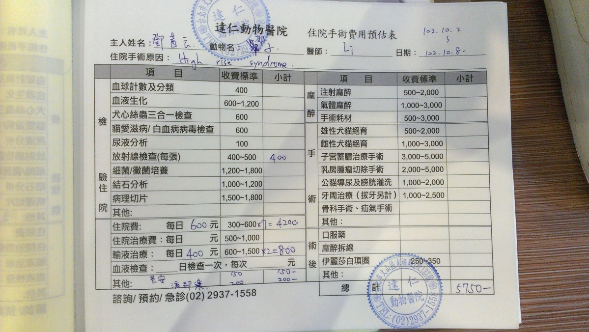 主題: 小貓跳樓救回急急急! 申請者姓名: 鄧紫云 花色: 申請日期: 2013-11-06 22:09:26 申請者部落格: pppiiittt@gmail.com 申請者臉書網址: 所在縣市/合作醫院: 台北市/達仁動物醫院 治療費用: 5750元 需求人數: 7人 已結案 (2014-01-10 17:57:49) 報名人員: nai(已付款)、Cindy Chen x6(已付款)、 候補人員: 動物病情說明: 生命真的很奇妙。