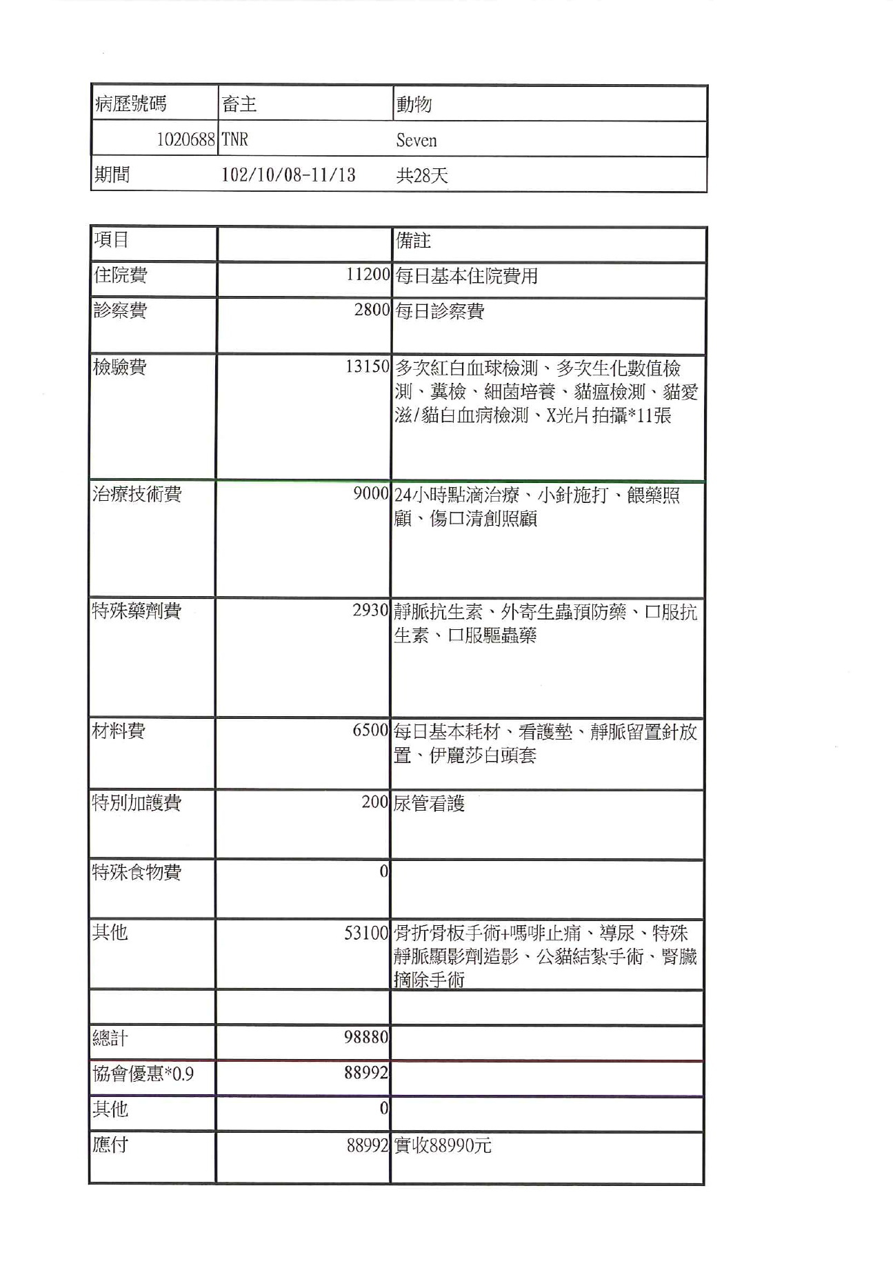主題: 車禍大腿骨折腎臟輸尿管斷裂 申請者姓名: 臺北市支持流浪貓絕育計劃協會 花色: 申請日期: 2013-11-21 16:13:40 申請者部落格: 申請者臉書網址: 所在縣市/合作醫院: 台北市/極光動物醫院 治療費用: 88990元 需求人數: 92人 已結案 (2014-01-10 17:55:52) 報名人員: Patrick x2(已付款)、Hung(已付款)、Queenie(已付款)、悅萱 x5(已付款)、Eason(已付款)、Monica Wang(已付款)、Larry Shen(已付款)、Bei Bei Wang(已付款)、vivian(已付款)、Kimi Huang(已付款)、Ou Han x2(已付款)、Kiki Liang(已付款)、李真(已付款)、Eva Wen(已付款)、余蛋娘(已付款)、安榭(已付款)、Joba Huang(已付款)、貓空(已付款)、RitaPeng x2(已付款)、Fei Su x3(已付款)、philip x2(已付款)、Grace Luo(已付款)、yuki x5(已付款)、Lee Jing Yi(已付款)、miraai(已付款)、Jessica Wu(已付款)、Cindy Chen(已付款)、Patricia Hsiao(已付款)、劉明玲(已付款)、櫻花妹(已付款)、如絲(已付款)、Wendy x3(已付款)、apin(已付款)、Eason(已付款)、貓公會淡水海貓分部 x4(已付款)、Shan Chou x3(已付款)、Yao-Hsien Tseng x2(已付款)、Nora Chu、stella x2(已付款)、夢東橋(已付款)、Emily Chou(已付款)、林 ミドリ(已付款)、陳噗奇(已付款)、Ava(已付款)、Jocelyne YuYu Kao、Chafia(已付款)、Ppn Huang(已付款)、Jiens Yu(已付款)、Jocelyne YuYu Kao、Jocelyne YuYu Kao x2、Jocelyne YuYu Kao x3、Jocelyne YuYu Kao x3(已付款)、Jocelyne YuYu Kao x4、ERic YU(已付款)、Patrick x2(已付款)、Fenny Hsu(已付款)、康寶(已付款)、Wang Mu(已付款)、meemee(已付款)、Connie(已付款)、Vincent Ho(已付款)、林韋韋(已付款)、Eucalyptus Wu(已付款)、BEAN(已付款)、Jasmine Lin(已付款)、文祥(已付款)、Michelle Chou(已付款)、lavinia x4(已付款)、Tiffany Shen(已付款)、 候補人員: 動物病情說明: 新北幅員遼闊,各式各樣的貓咪狀況都有,