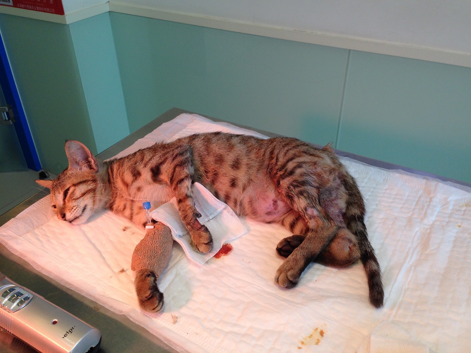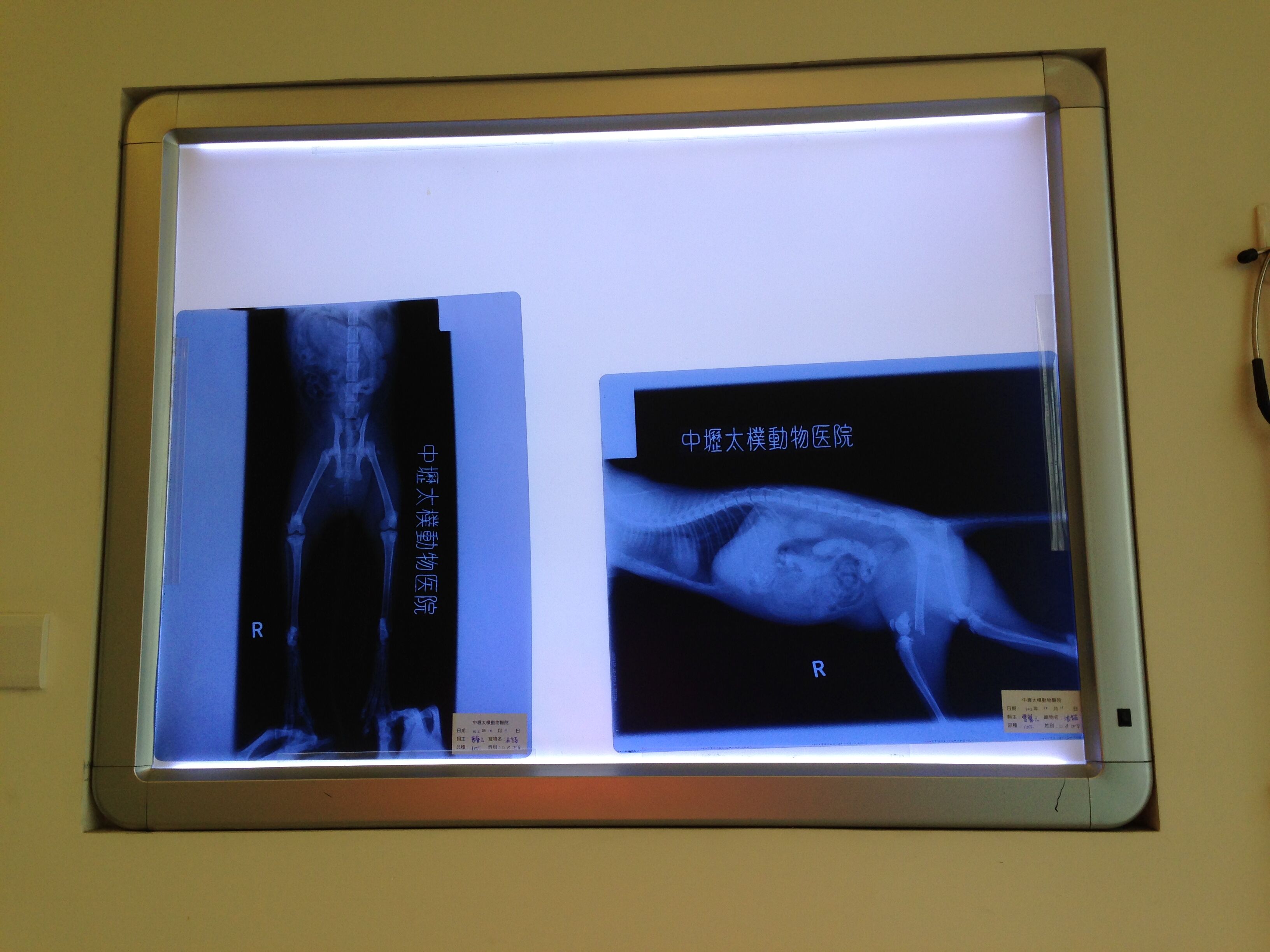 醫生看X光判斷應該是被車輾到,右腳股股遠端骨折、股股頭斷、坐骨骨折、左腳大腿,右前肢掌內側皆有大範圍撕裂傷,而且應該被撞到有兩、三天了,做手術可以治療好,行走不會受影響