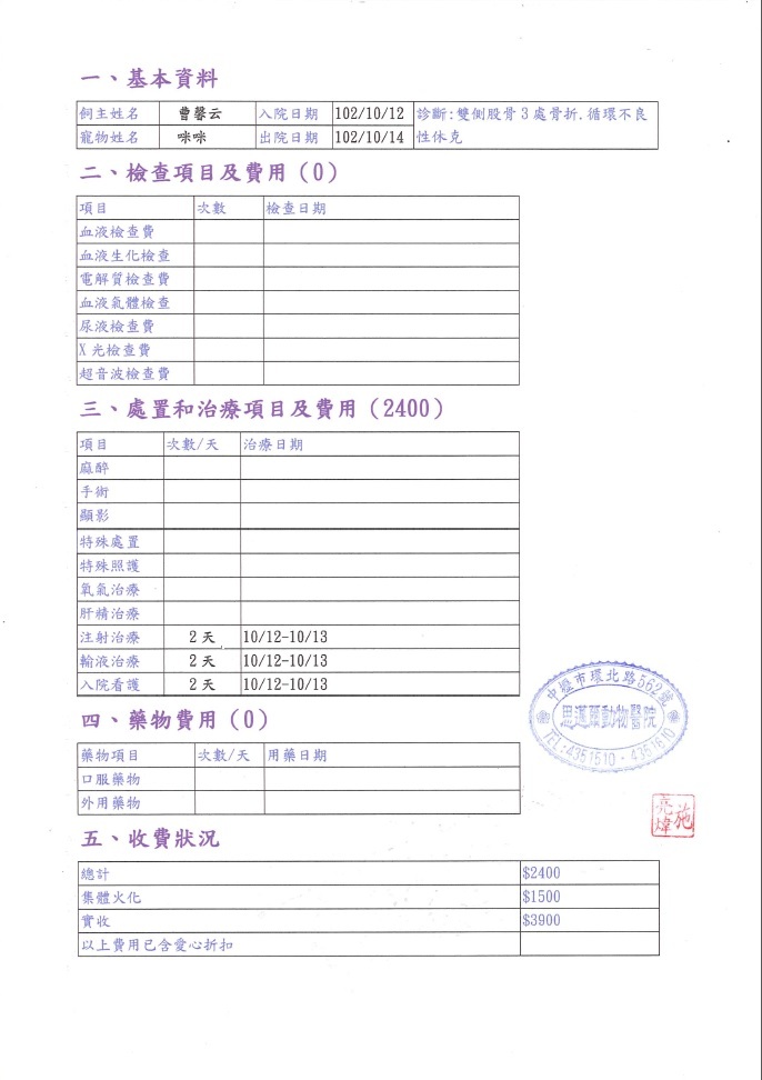主題: 路邊發現的車禍貓-咪咪 申請者姓名: 曹馨云 花色: 申請日期: 2013-10-17 22:14:36 申請者部落格: 申請者臉書網址: 所在縣市/合作醫院: 桃園縣/思邁爾動物醫院 治療費用: 3900元 需求人數: 5人 已結案 (2014-01-10 17:55:37) 報名人員: Timmy Wang、黃金勇(已付款)、潘逸群 x3(已付款)、Josiane Hsu(已付款)、 候補人員: 動物病情說明: 10/11早上在路邊發現一隻疑似被車撞到的貓咪,我們靠近的時候發現牠雙後腳外翻爬行,因為受到驚嚇貓咪一直往前跑到前面遊覽車的底下不肯出來,花了一番工夫才把他從車底下抓出送醫,因情況緊急先送至中壢市太樸動物醫院,做X光檢查跟血液檢查。