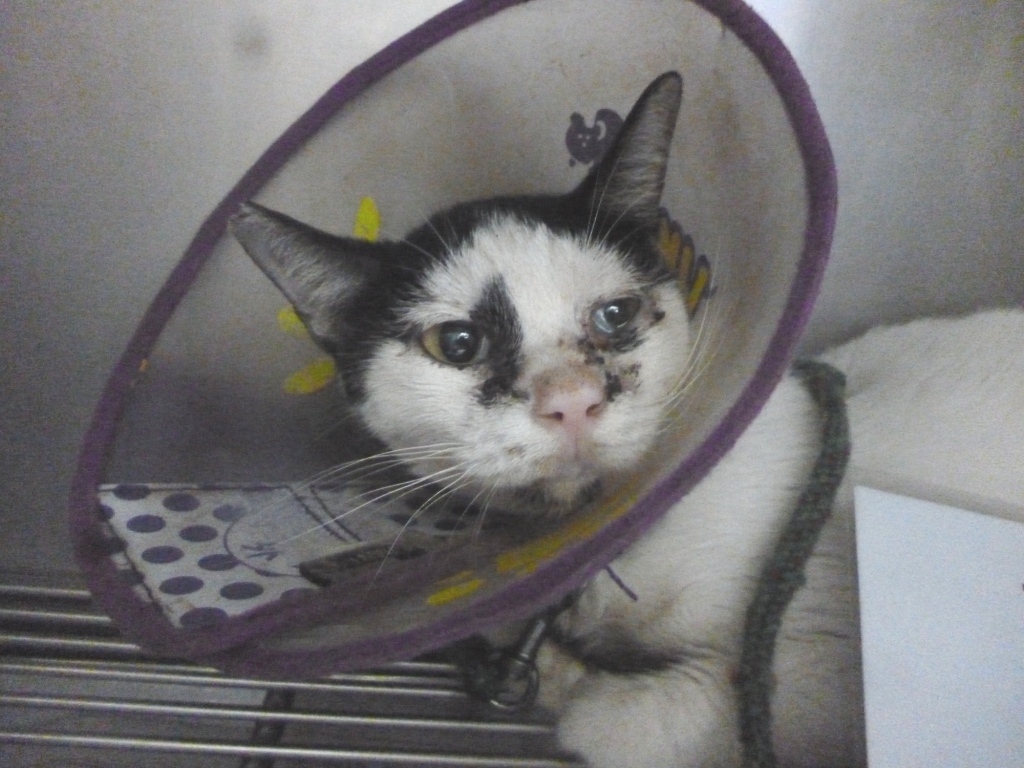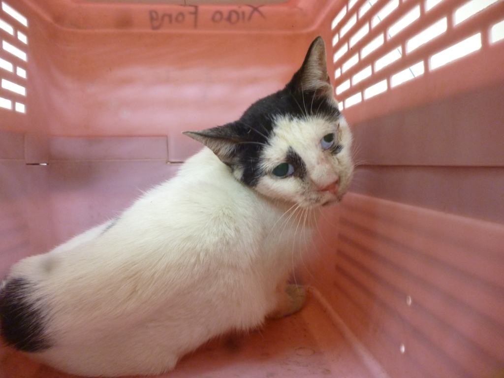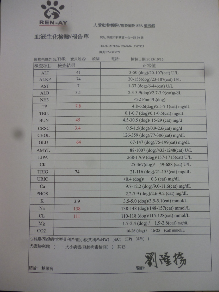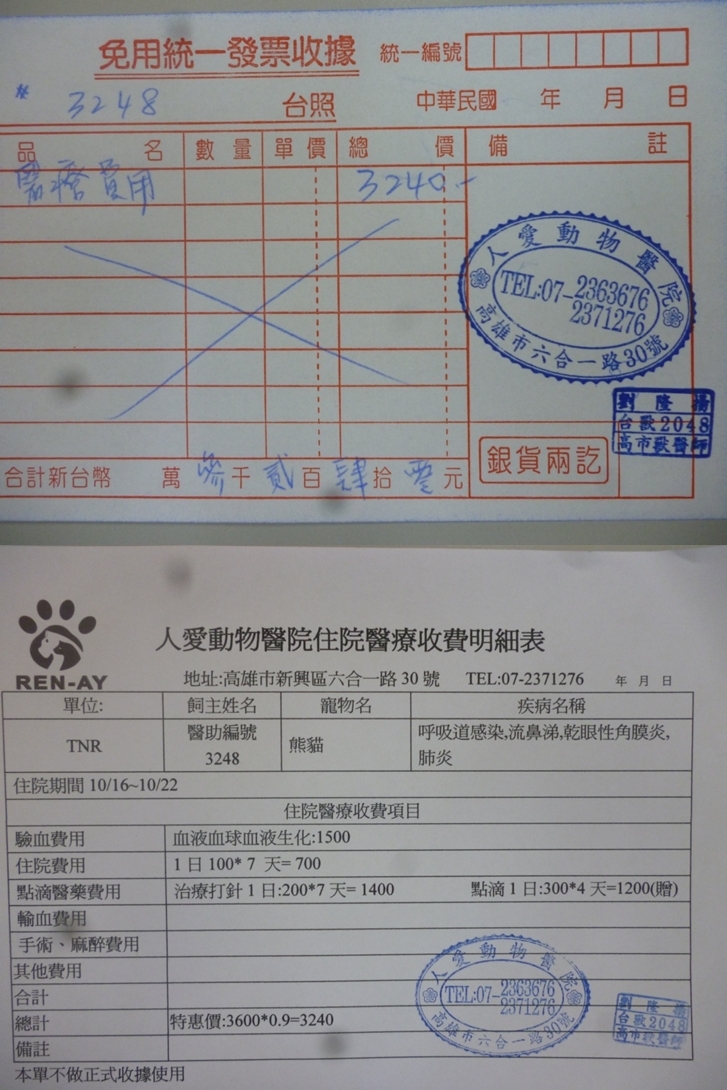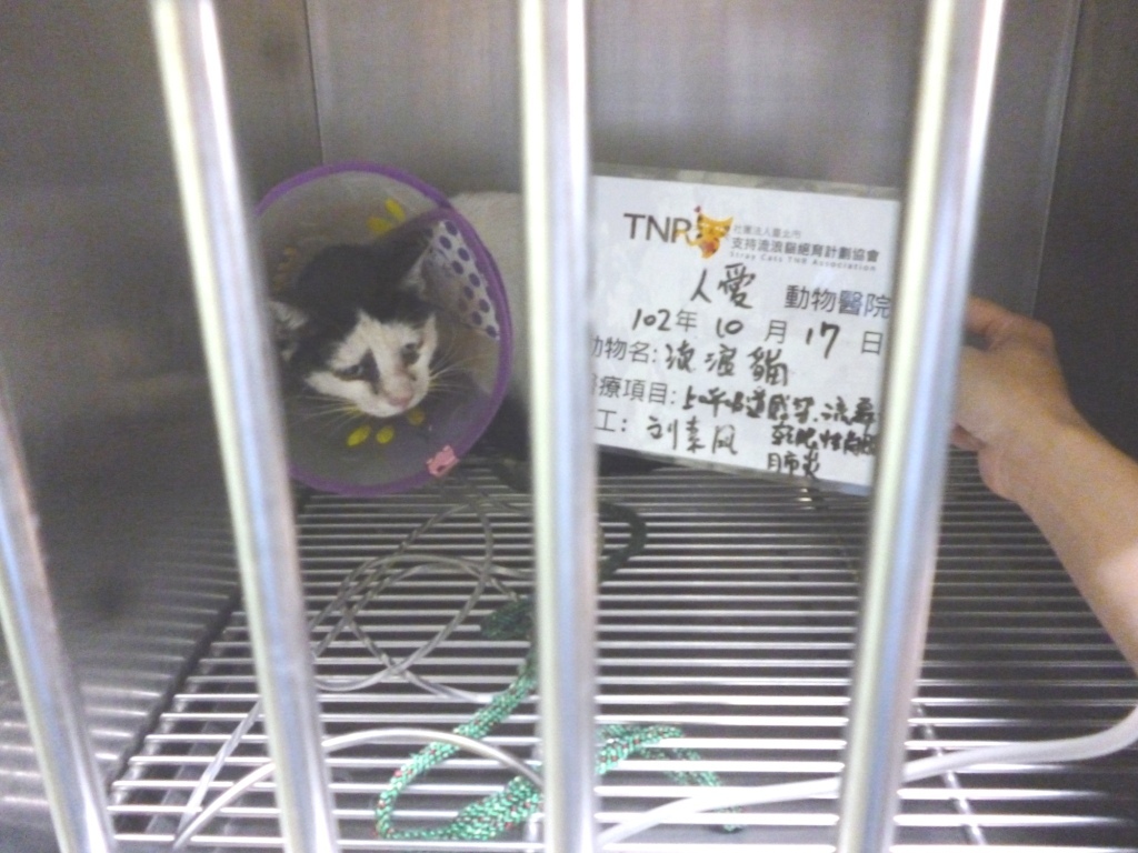 主題: 流浪貓上呼吸道感染,流鼻涕,乾眼性角膜炎 申請者姓名: 劉素鳳 花色: 申請日期: 2013-10-24 23:55:18 申請者部落格: 申請者臉書網址: 所在縣市/合作醫院: 高雄市/人愛動物醫院 治療費用: 3240元 需求人數: 9人 已結案 (2014-01-10 17:55:26) 報名人員: Kuen-Lin Tsai(已付款)、Sherry Hu(已付款)、小娃(已付款)、壹零(已付款)、小涵(已付款)、Kate(已付款)、Fu Nk(已付款)、Kelly Chen(已付款)、Lulu(已付款)、 候補人員: 動物病情說明: 這是在建國路金山清粥小菜旁發現的貓~原本只是要抓來結紮~結紮時醫生發現上呼吸道感染,流鼻涕,乾眼性角膜炎~ 醫生建議驗血確診~(流浪貓在尚未開刀前由於緊張躁動會造成聽診誤差~在麻醉開刀後由於尚在鎮靜麻醉下不影響聽診~)聽診中可聽見心肺雜音!於是隔天抽血做進ㄧ步確診!果然發現白血球非常高!確定為肺炎!腎指數較高於是才建議做進ㄧ步治療!因為兩塊黑色花紋剛好長在眼睛周圍~於是我們後來私下叫他熊貓~熊貓只是緊張時跳上跳下~或縮成ㄧ團~不至於攻擊~還蠻好撈出來~當然就方便治療~入院當天比較虛~為了先救命~住院當天就先架上點滴補充營養~接下來3天都維持著點滴觀察~經過這一週治療~確定食慾與精神都恢復,呼吸道OK~聽診也沒心肺雜音後~才放心R回原地繼續放養觀察~(美中不足的是他雖然給點眼藥水~卻不給擦臉~導致雖然瞬膜已經消腫縮回去~眼神明亮許多~但臉還是髒髒的~回去之後應該會自行把臉撥乾淨喔)