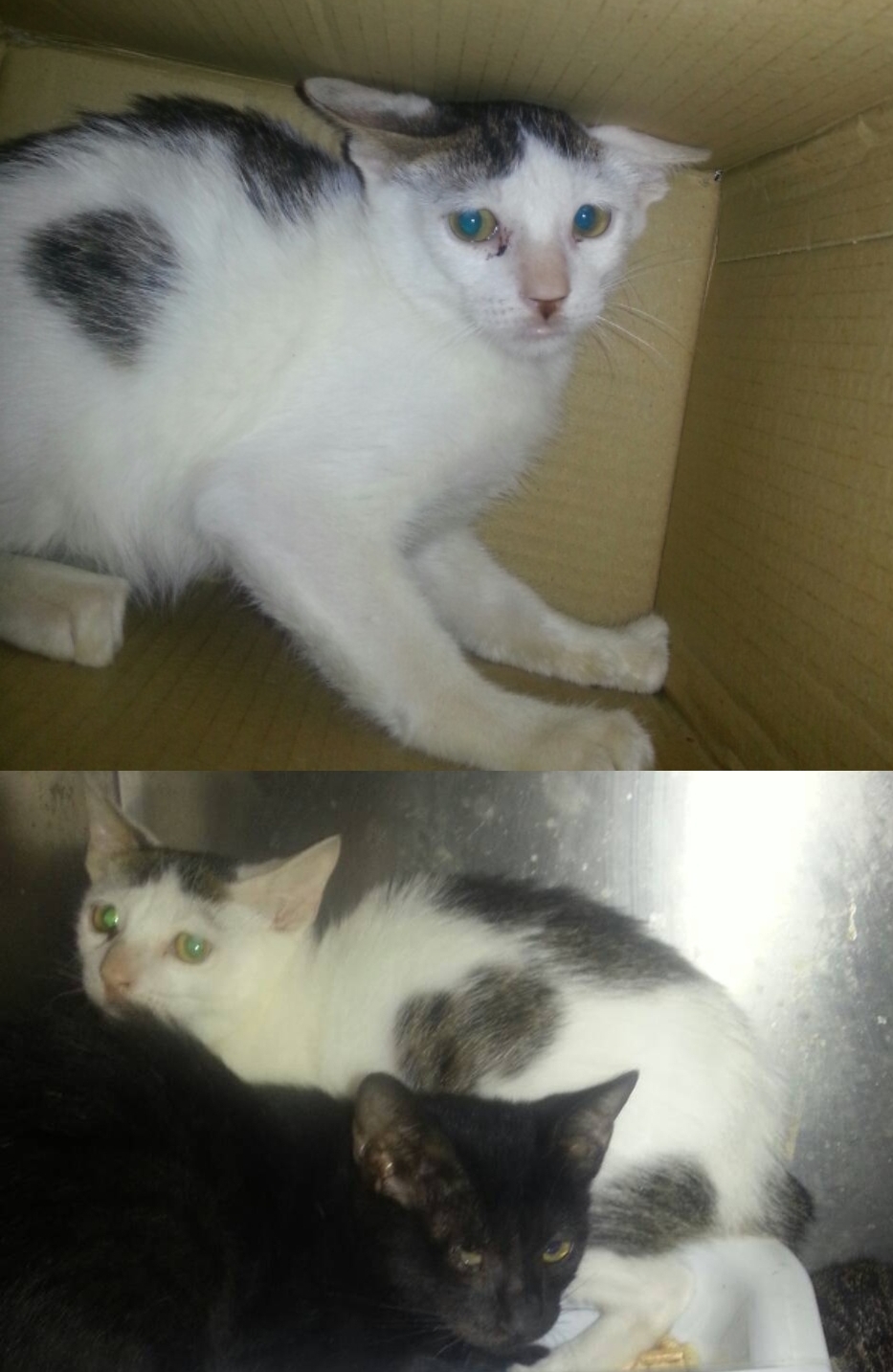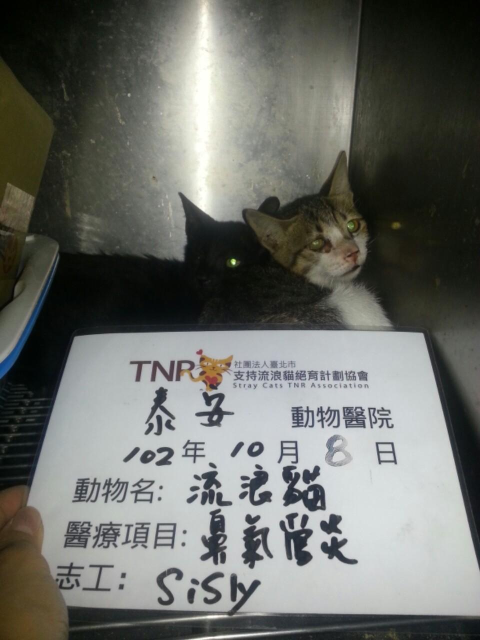 主題: 前鎮金鑽夜市附近的病貓 申請者姓名: 劉雅雲 花色: 申請日期: 2013-10-29 11:42:02 申請者部落格: 申請者臉書網址: 所在縣市/合作醫院: 高雄市/泰安動物醫院 治療費用: 5100元 需求人數: 6人 已結案 (2014-01-10 17:55:19) 報名人員: 亦宣(已付款)、小琦(已付款)、Nico Ting(已付款)、M&M(已付款)、茵琪 x2(已付款)、 候補人員: 動物病情說明: 這是在金鑽夜市附近巷子發現的貓咪, 停下來誘捕他們結紮, 但這三小貓都有點生病,黑的那隻有一眼好像壞掉了,白底虎的眼睛感染有鼻氣管炎,另一隻黑白貓也有鼻氣管炎. 送醫後先治療鼻氣管炎的問題, 慢慢的貓咪也變比較親人了, 但還是會有點緊張, 所以放紙箱讓他們躲藏, 每天醫院助理都會抓他們出來看看狀況, 慢慢地病已經康復了, 會再評估他們是否適合送養, 若不適合會讓他們回原地, 那邊算蠻安全的, 也有阿婆會放食物, 當地也有一隻三腳狗生活在那巷子, 附近的居民都算友善喔.