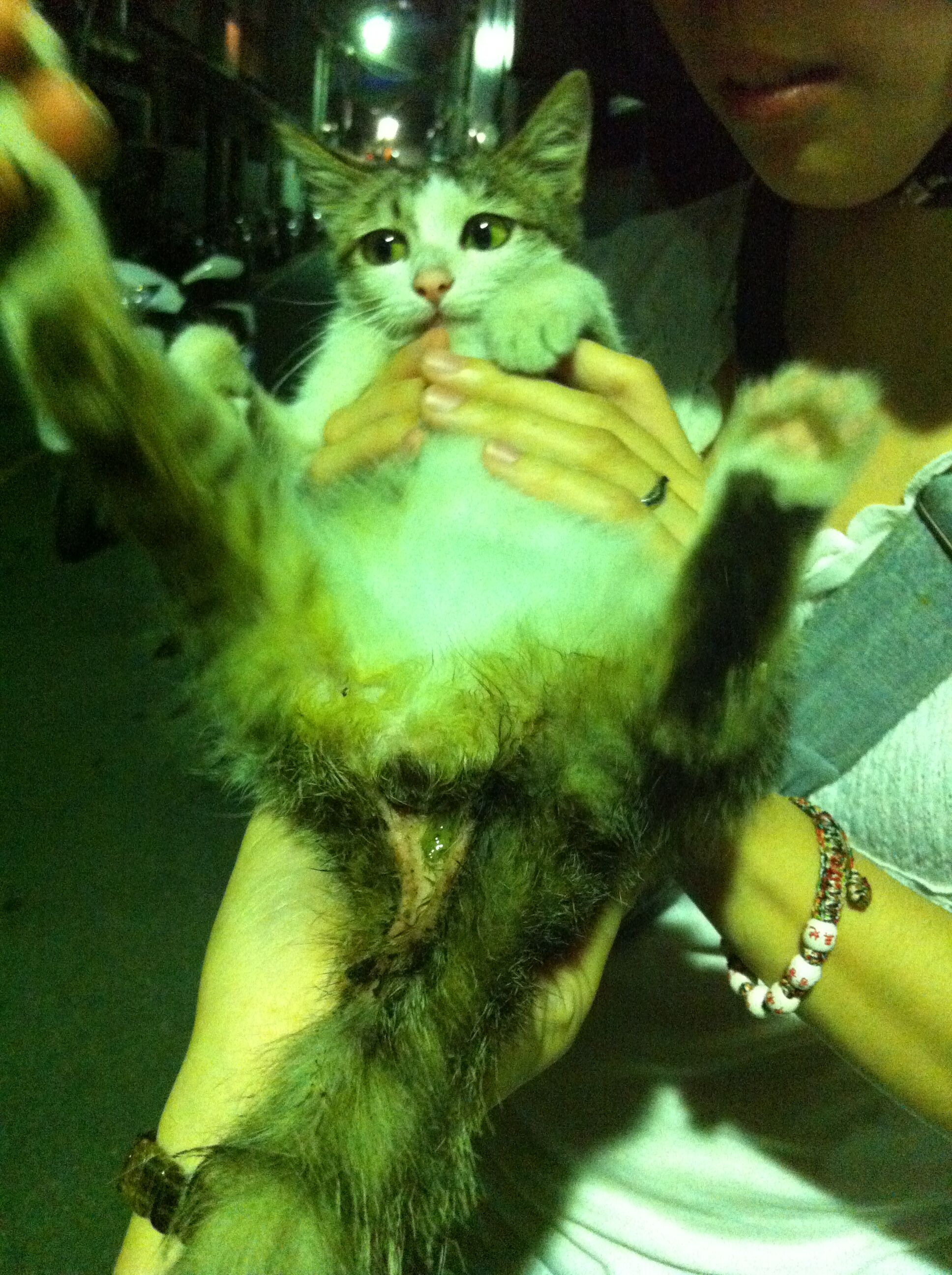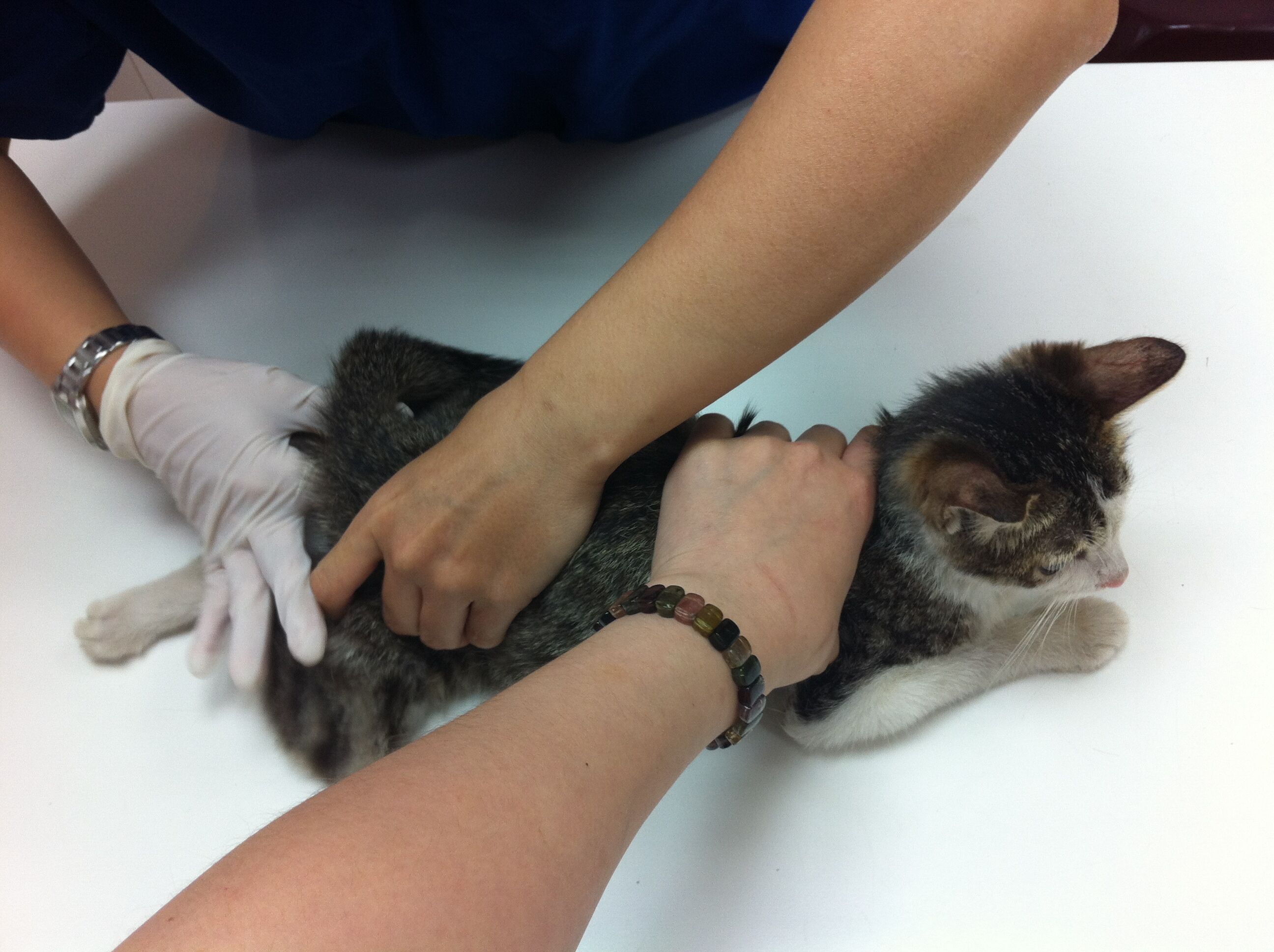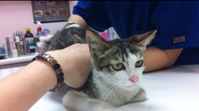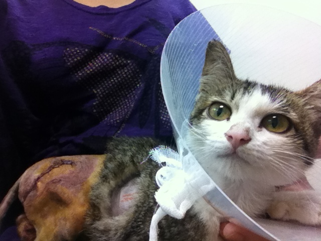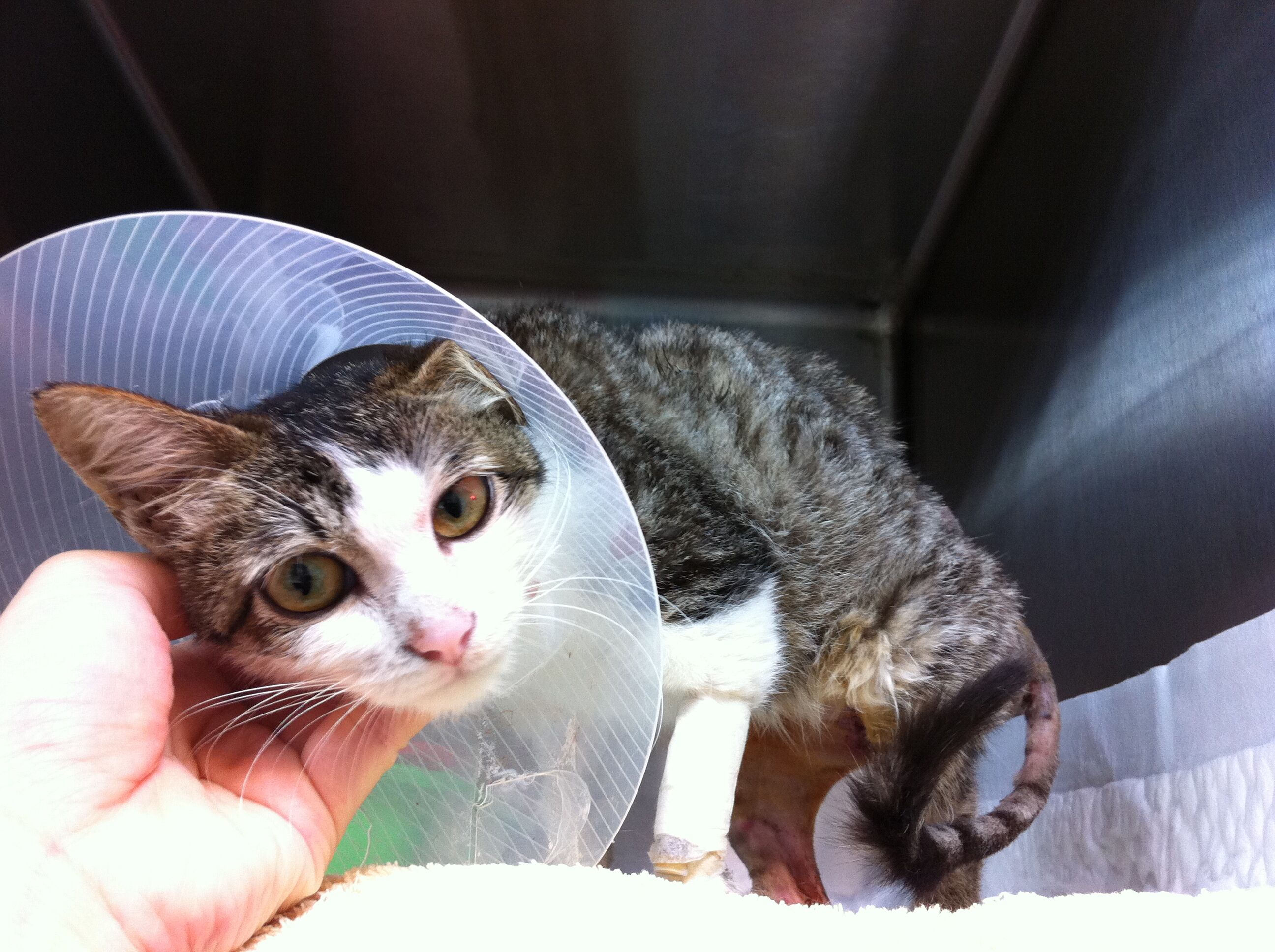 中和區的黃愛媽發現餵養的4個月流浪小貓很虛弱癱軟,腹部異常脹大,礙於經濟因素也未帶小貓就醫,志工知道後先自費代小貓就醫,醫生表示觸摸有腸阻塞情形,很可能需要開刀治療,先開藥服用,但隔日小貓一直有用力如廁樣,非常痛苦仍解不出糞便,下面出不去上面也進不來,非常虛弱,5/9緊急通報協會送往沐恩動物醫院,骨盆狹窄無法指診,照x光確定骨盆骨折至少10天以上,醫生研判是車禍外力導致腸骨(iliac)骨折凹陷,骨盆口直徑只剩0.8公分,完全無法排便,已麻醉通腸挖糞,但一定要手術將骨盆口打開否則終生無法排便,5/1行骨盆矯正手術,植入鋼板,她雖然有點虛弱,且碰到屁屁會痛,但是看到人會拼命站起來撒嬌