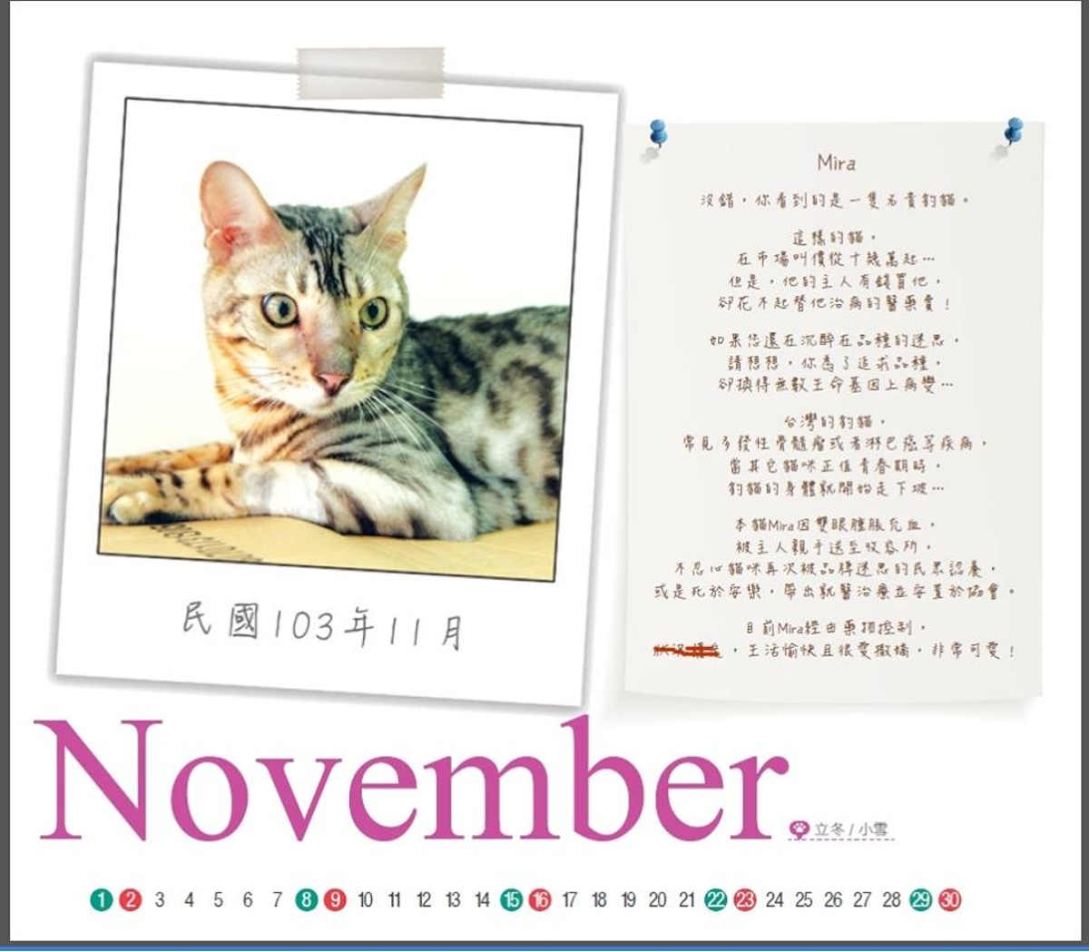 Mira是協會2014年11月桌曆明星,