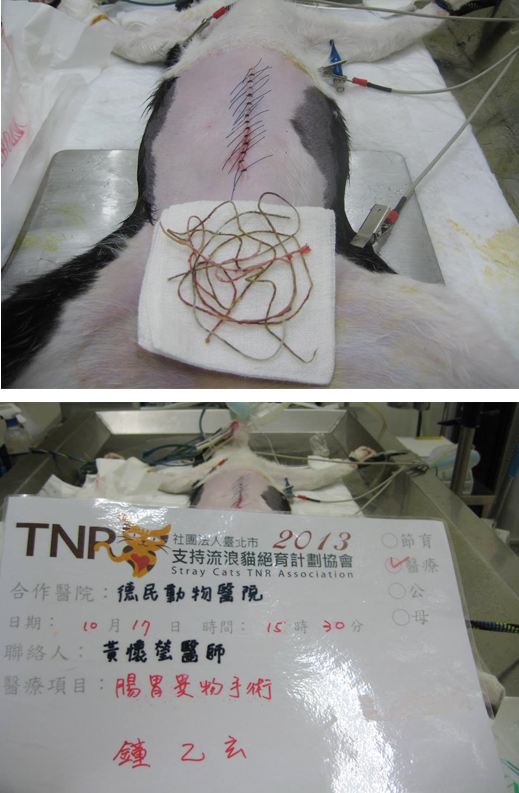 主題: 吃下繩子排不出來的貓 申請者姓名: 鍾乙玄 花色: 申請日期: 2013-11-17 19:38:55 申請者部落格: 申請者臉書網址: http://www.facebook.com/ihsuanchung 所在縣市/合作醫院: 高雄市/新德民動物醫院 治療費用: 19920元 需求人數: 21人 已結案 (2014-01-10 17:53:47) 報名人員: LovelyBaby(已付款)、Cindy Chen x3(已付款)、壹零(已付款)、Eva Tsai(已付款)、林小豬 x3(已付款)、sophiawu(已付款)、連水安(已付款)、楊乃維(已付款)、黃小馨、姆姆(已付款)、星星小蘋果(已付款)、Ou Han x2(已付款)、orange(已付款)、林小豬 x3(已付款)、heyblack(已付款)、 候補人員: 動物病情說明: 我是半夜餵貓,在找沒出來吃飯的貓時,在路邊發現了他。
