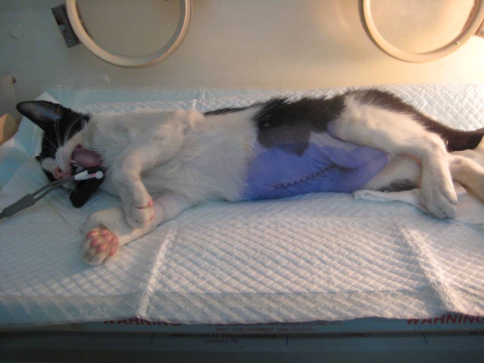 術後第4天,又好了一點,會撐起身子,還會發出聲音。但血檢狀況卻不好,白血球從一開始的飆高,開始垂直式快速的往下降。醫生認為貓咪可能還有其他的病毒感染,加強各種營養及藥物的給予。