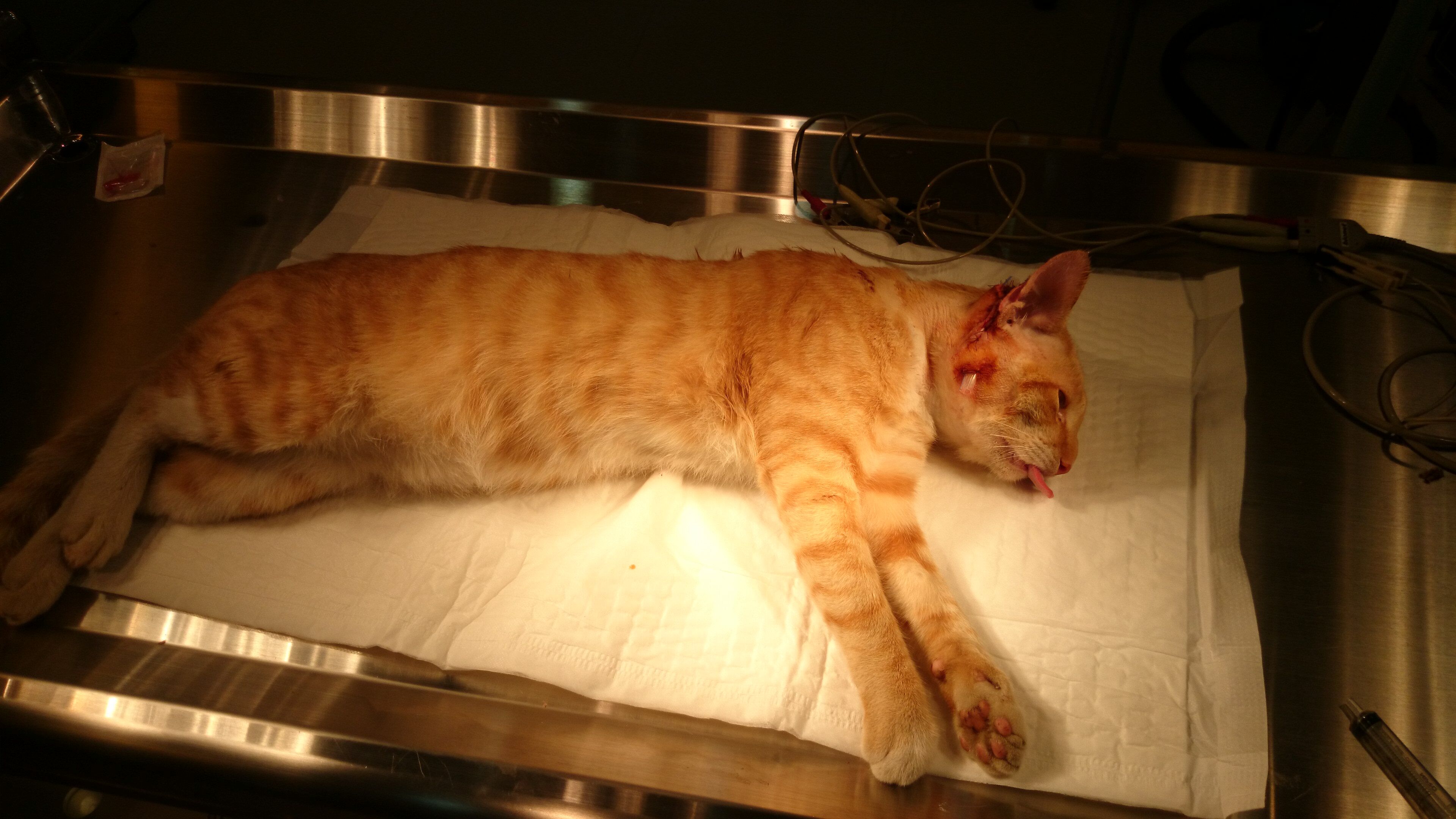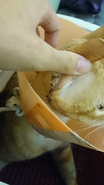 主題: 放飯時發現右頰腫大的橘貓 申請者姓名: 彭子憶 花色: 申請日期: 2013-11-22 19:22:52 申請者部落格: 申請者臉書網址: 所在縣市/合作醫院: 桃園縣/思邁爾動物醫院 治療費用: 7500元 需求人數: 9人 已結案 (2014-01-10 17:53:24) 報名人員: Kate(已付款)、Iong Lim(已付款)、Ciara Ting(已付款)、王千枝(已付款)、lunyi(已付款)、Emily Chou(已付款)、Hannah Liao(已付款)、ERic YU(已付款)、MOMOCAT(已付款)、 候補人員: 動物病情說明: 我餵食住家附近浪貓,發現其中一隻橘子公浪貓(橘三),臉頰異常腫大有傷口,裝籠後橘三用後腳抓癢,傷口馬上流血流膿,我馬上送醫治療+結紮;經醫生診察應該是打架被咬傷,所以右耳後方被咬兩個洞腫起來,當晚醫生進行清創手術,埋引流管(清洗傷口),住院約一週;因傷口需要時間恢復,所以已出院帶回家照顧。