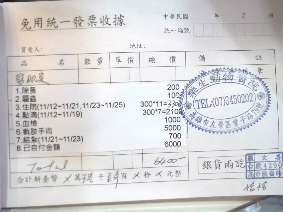 於11/12上午9:30送至高雄市樂生動物醫院治療,