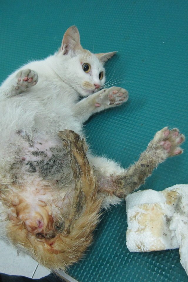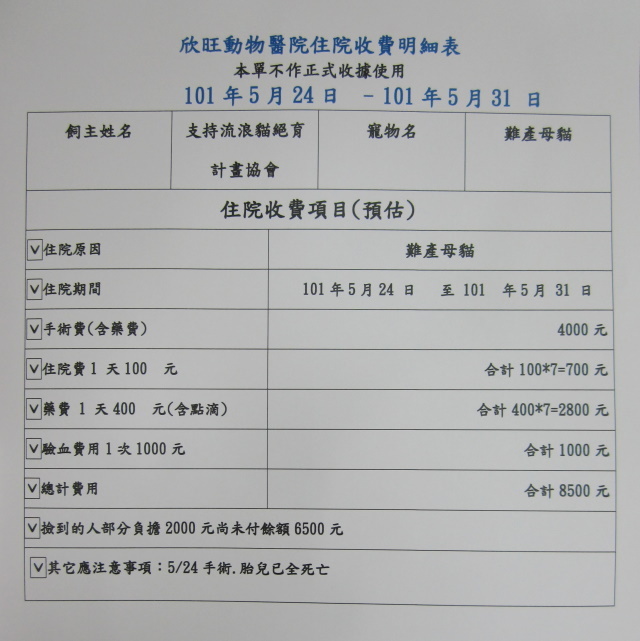 主題: 難產小黃白母貓 申請者姓名: 蔡葦澄 花色: 申請日期: 2012-05-24 14:18:18 申請者部落格: 申請者臉書網址: 所在縣市/合作醫院: 台北市/欣旺動物醫院 治療費用: 6500元 需求人數: 16人 已結案 (2013-06-13 11:50:30) 報名人員: ㄚ芳(已付款)、ㄚ芳(已付款)、lee ping(已付款)、LukeC(已付款)、misselaine(已付款)、小映(已付款)、楊雅雯(已付款)、Missin Kao、麵毛匪(已付款)、Missin Kao(已付款)、mokumao(已付款)、Michelle Dalal Jian(已付款)、TingTing In(已付款)、陳彥蓁(已付款)、潘玥君(已付款)、Hsuan Cheng(已付款)、小舟(已付款)、 候補人員: 小辣椒、Weikei Chiu、趙寶妮、Judy Meow、Yingying、 動物病情說明: 永春市場(長春里)攤販發現有一隻小母貓一動也不動的窩著,大家七嘴八舌討論但始終沒有人帶貓貓去就醫,其中一位攤販聯絡王小姐,因為十年前也發生相同的事情,當時是王小姐帶去就醫,但是王小姐早已不再這裡擺攤,隔天王小姐到市場內把貓貓抱到動物醫院,貓已發出腐敗的味道、很痛苦不斷出血,王小姐也是捨不得貓,但醫療費用無力全額負擔,只能幫忙兩千元,為保住母貓的性命已先緊急手術,兩隻小貓同時卡在產道,拿出來已死亡發臭,恐怕難產時間不只兩天,血液檢查除肝指數過高外其餘正常,已上點滴並施打抗生素,預估需上點滴抗生素治療一周。