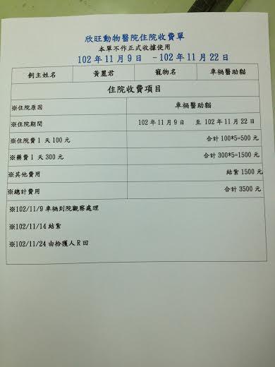 主題: 車禍受傷懷孕母貓 申請者姓名: 黃麗君 花色: 申請日期: 2013-11-23 12:52:25 申請者部落格: 申請者臉書網址: 所在縣市/合作醫院: 台北市/欣旺動物醫院 治療費用: 3500元 需求人數: 9人 已結案 (2014-01-10 17:49:47) 報名人員: HI HI Little(已付款)、Miho Huang x2(已付款)、Jason Chang(已付款)、Kiki Liang(已付款)、Choco Chen x2(已付款)、sandy_huanglichuan(已付款)、曾贏萱(已付款)、 候補人員: 李坤財、 動物病情說明: 此懷孕母貓橫跨新生高架馬路跨區到我餵食的區域,因不小心被車撞傷, 所以昨晚10:30緊急送至太樸動物醫院