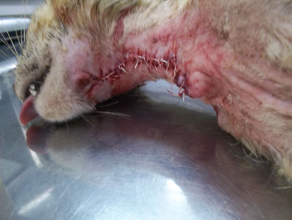 主題: 喉嚨傷口皮全掉只見紅之小虎 申請者姓名: 鄭如君 花色: 申請日期: 2013-11-26 21:26:30 申請者部落格: 申請者臉書網址: https://www.facebook.com/elizainkorea 所在縣市/合作醫院: 彰化縣/成愛動物醫院 治療費用: 4920元 需求人數: 6人 已結案 (2014-01-10 17:49:42) 報名人員: miraai(已付款)、阿貝 x2(已付款)、Ne Ko(已付款)、Ne Ko、clement(已付款)、Derek Jao(已付款)、 候補人員: Vanessa Cheng、Agon Liu、 動物病情說明: 平時都會來吃東西的小虎,在消失了好幾天之後,今天又出現了,不同的是,身上多了很大一塊傷口,從脖子下方開始長約8公分寬約4公分,皮已經都不見了,呈現鮮紅色,傷口處一直有蒼蠅過來,緊急帶到鹿港成愛醫院,清創縫合後傷口好幾度裂開(因為牠皮很薄),一度懷疑有其他病症,還好生化檢查結果一切正常。