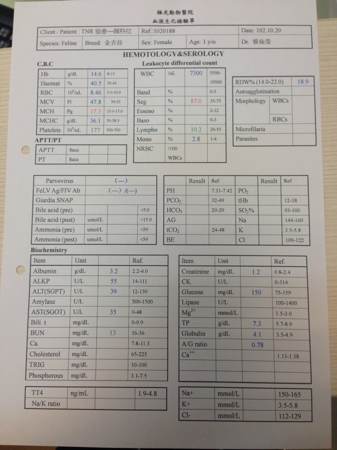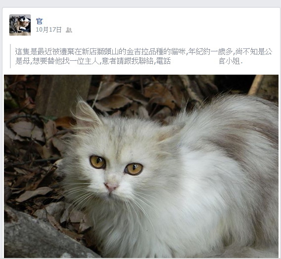 主題: 飢餓消瘦被丟棄在新店虎頭山的金吉拉 申請者姓名: 臺北市支持流浪貓絕育計劃協會 花色: 申請日期: 2013-11-20 17:31:30 申請者部落格: 申請者臉書網址: 所在縣市/合作醫院: 台北市/極光動物醫院 治療費用: 5220元 需求人數: 13人 已結案 (2014-01-10 17:49:35) 報名人員: Jason Chang(已付款)、ZLIN(已付款)、Cathy(已付款)、蘇小吉(已付款)、蕭茹云(已付款)、skylung x2(已付款)、Sean M. Wu x2、皮皮貓、zoe(已付款)、太委屈(已付款)、Suegie(已付款)、張納豆(已付款)、Jessica Hsu(已付款)、周星星(已付款)、 候補人員: Yamada、Daini Lee、 動物病情說明: 佩特拉是新店愛媽通報案件,